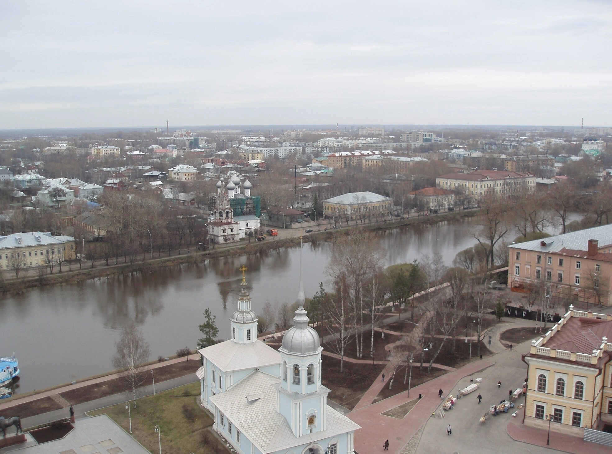 Перед церковью простирается площадь, где можно заметить несколько человек и повозки, однако детали их фигур неразличимы из-за высокой точки съёмки. За храмом течёт широкая река Вологда, в которой отражаются серые облака. На противоположном берегу располагается историческая застройка города: двух- и трёхэтажные здания, среди которых видны купола других церквей.