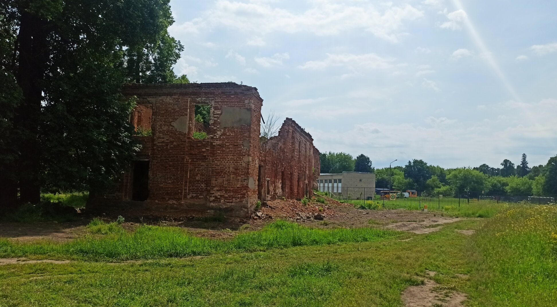Архитектурный облик здания относится к XIX столетию и представляет собой образец традиционного русского церковного зодчества. Сооружение выполнено из красного кирпича, характерного для храмового строительства указанного периода. На снимке просматриваются элементы конструкций, включая частично сохранившиеся стены и оконные проёмы, демонстрирующие первоначальные объёмы строения.