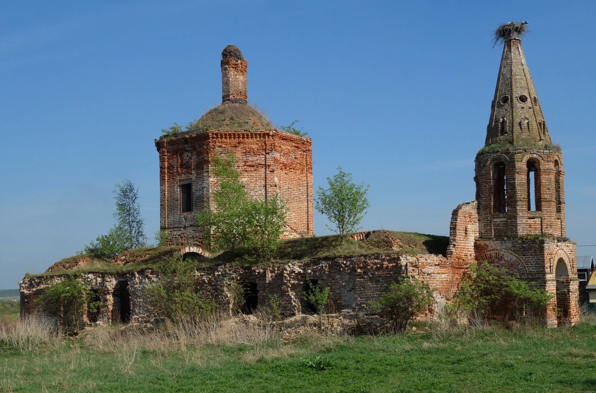 На представленной фотографии запечатлена полуразрушенная Церковь Александра Невского, также известная как храм Николая Чудотворца, расположенная в селе Высокиничи Жуковского района Калужской области. Храмовый комплекс, возведённый из красного кирпича, включает в себя основной объём и отдельно стоящую колокольню, которые ныне пребывают в удручающем состоянии.