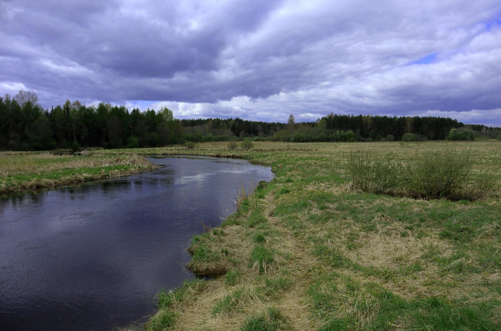 На переднем плане фотографии простирается водная гладь реки Нерль, отражающая небесную высь. За рекой раскинулось поле, а на заднем плане виднеется лесной массив, обрамляющий этот богоугодный пейзаж. Небесный свод покрыт облаками, создающими мягкое рассеянное освещение, что придает изображению особую духовную атмосферу умиротворения и благоговения.