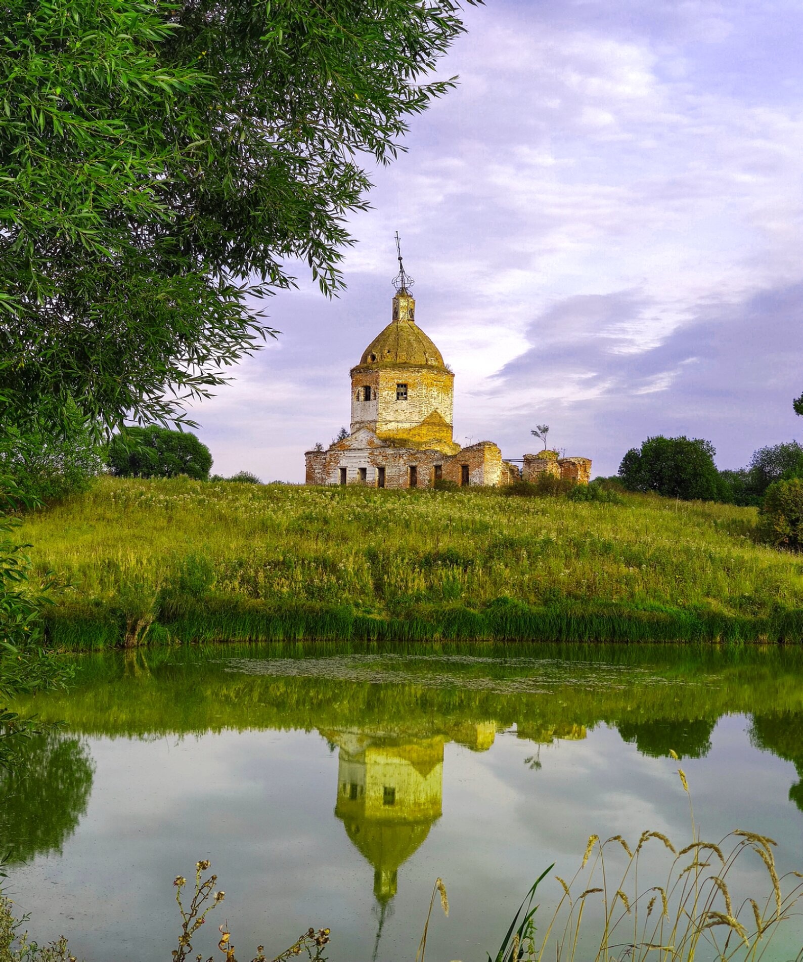 Храм гармонично вписан в природный ландшафт. На переднем плане фотографии виден водоём, в спокойных водах которого отражается величественный силуэт церкви. Прибрежная растительность, представленная камышами и свисающими ветвями деревьев, обрамляет композицию. Холм покрыт высокой травой и полевыми цветами, создавая ощущение единства творения Божия.