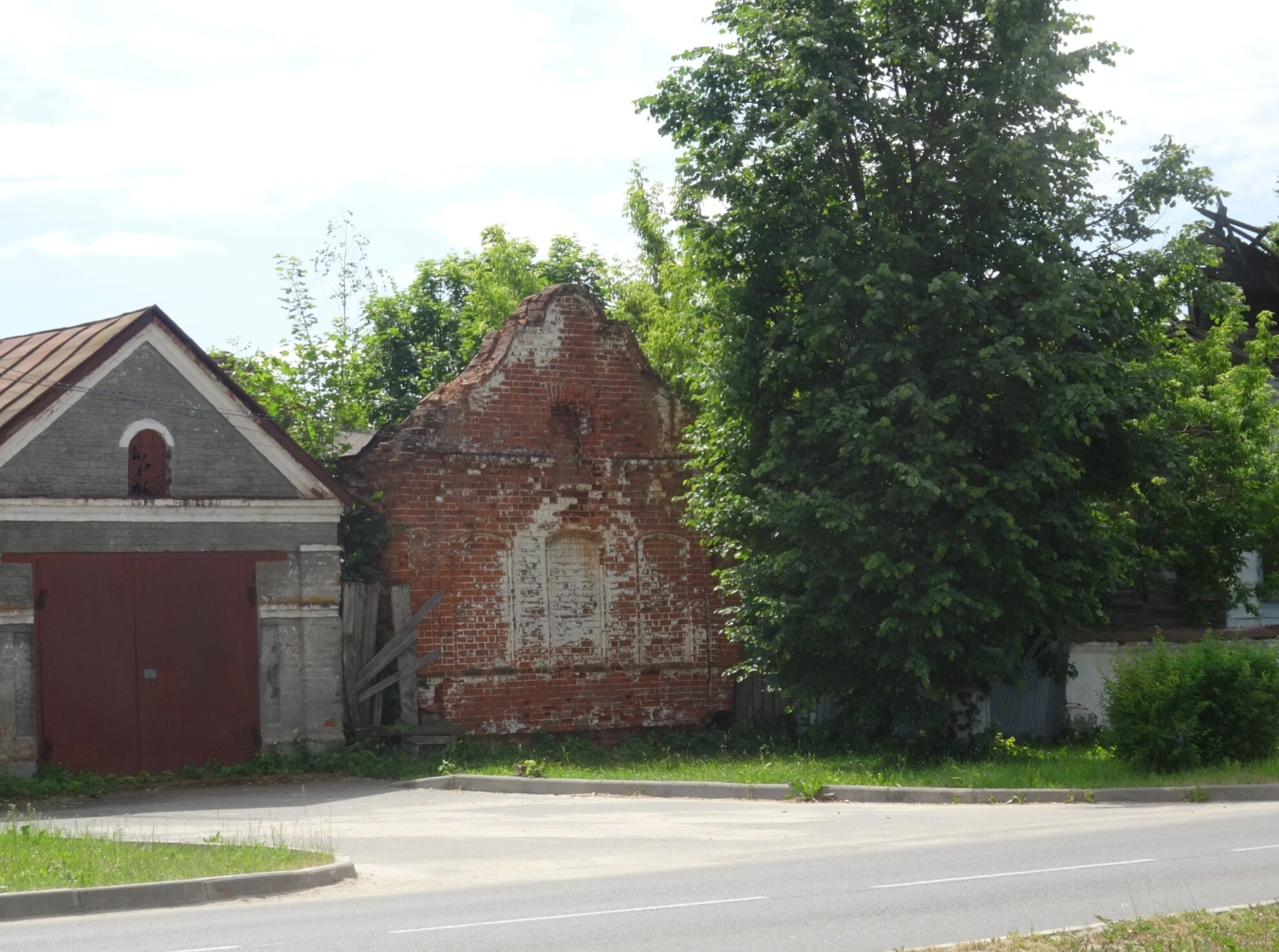 С левой стороны от разрушенной церковной стены просматривается небольшое строение серого цвета с двускатной кровлей, которое, вероятно, использовалось в хозяйственных нуждах при храме либо было возведено в более поздний период. Данная постройка создаёт дополнительный исторический контекст для восприятия всего архитектурного комплекса.