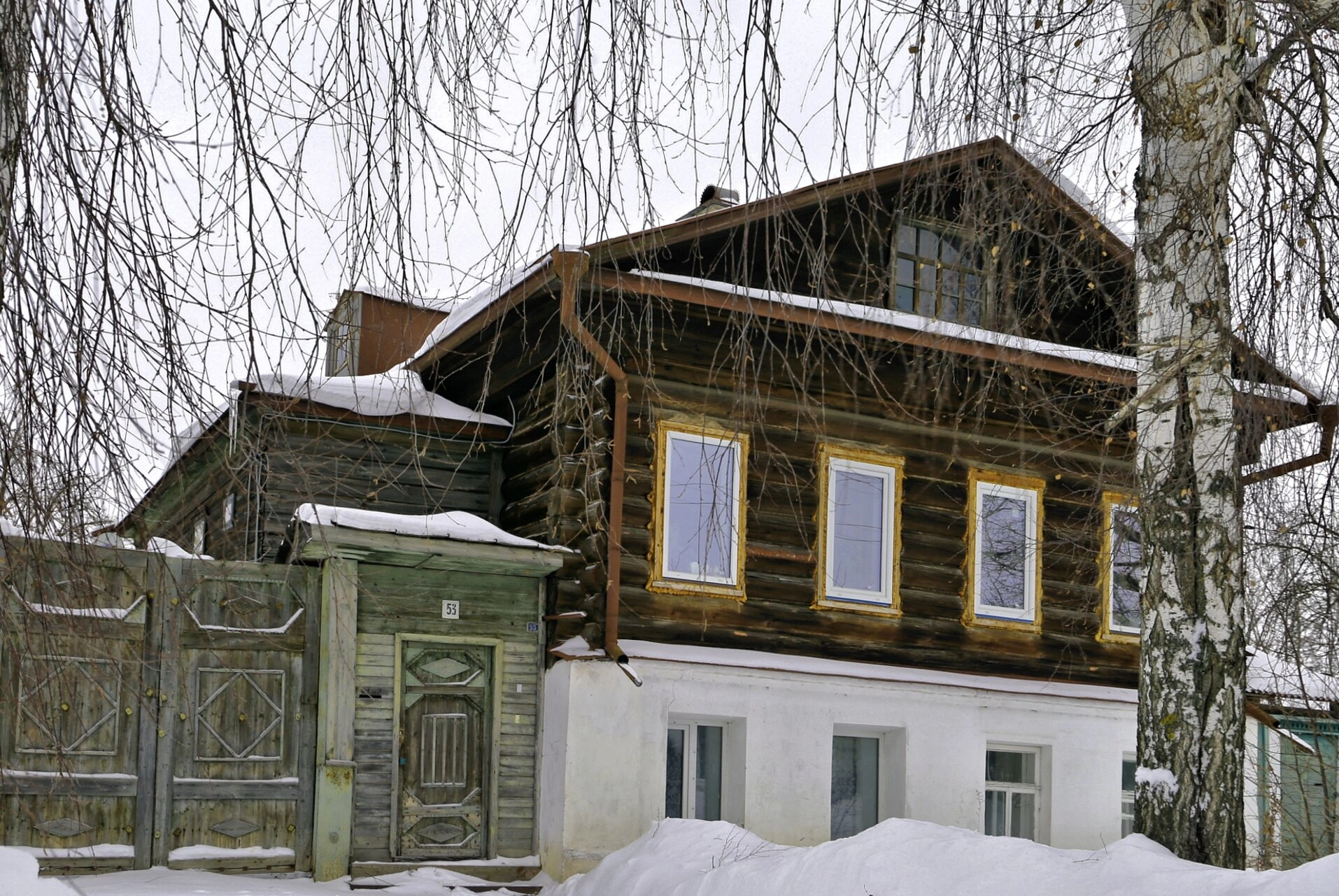 На представленной фотографии запечатлена Церковь Алексия, человека Божия, расположенная в исторической части города Шуя Ивановской области. Святыня представляет собой двухэтажное деревянное здание, архитектура которого отражает традиции русского церковного зодчества.