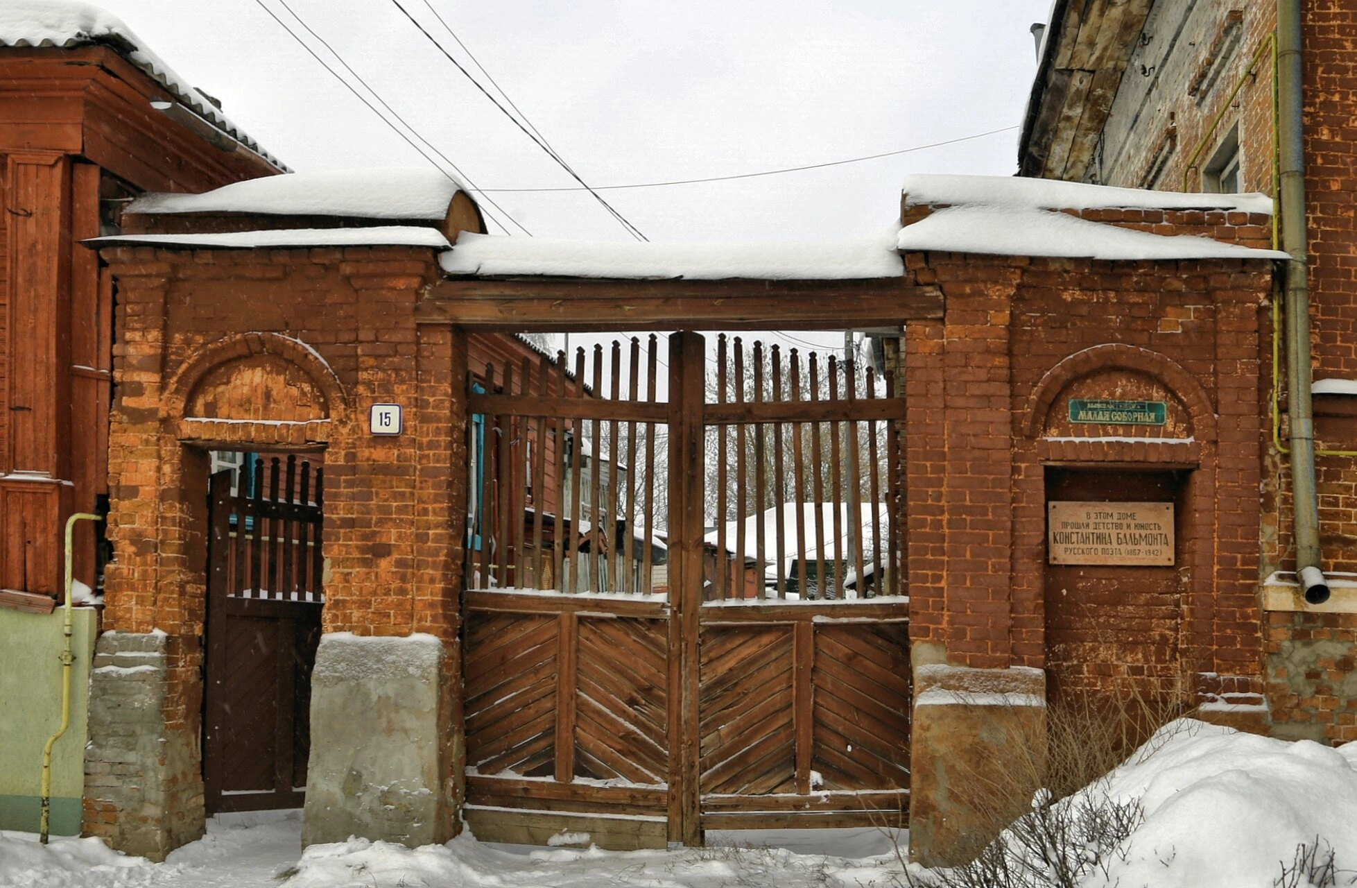 На представленной фотографии запечатлён зимний вид фасада церкви во имя святого Алексия, человека Божия, что расположена в городе Шуе Ивановской области. Святыня, возведённая из красного кирпича, предстаёт в снежном убранстве, символизирующем чистоту и духовное обновление. Массивные деревянные ворота с калиткой, украшенные номером «15», ведут во двор храмового комплекса. На стене справа от ворот укреплена табличка с наименованием улицы Соборной, носящей также имя Константина Бальмонта.