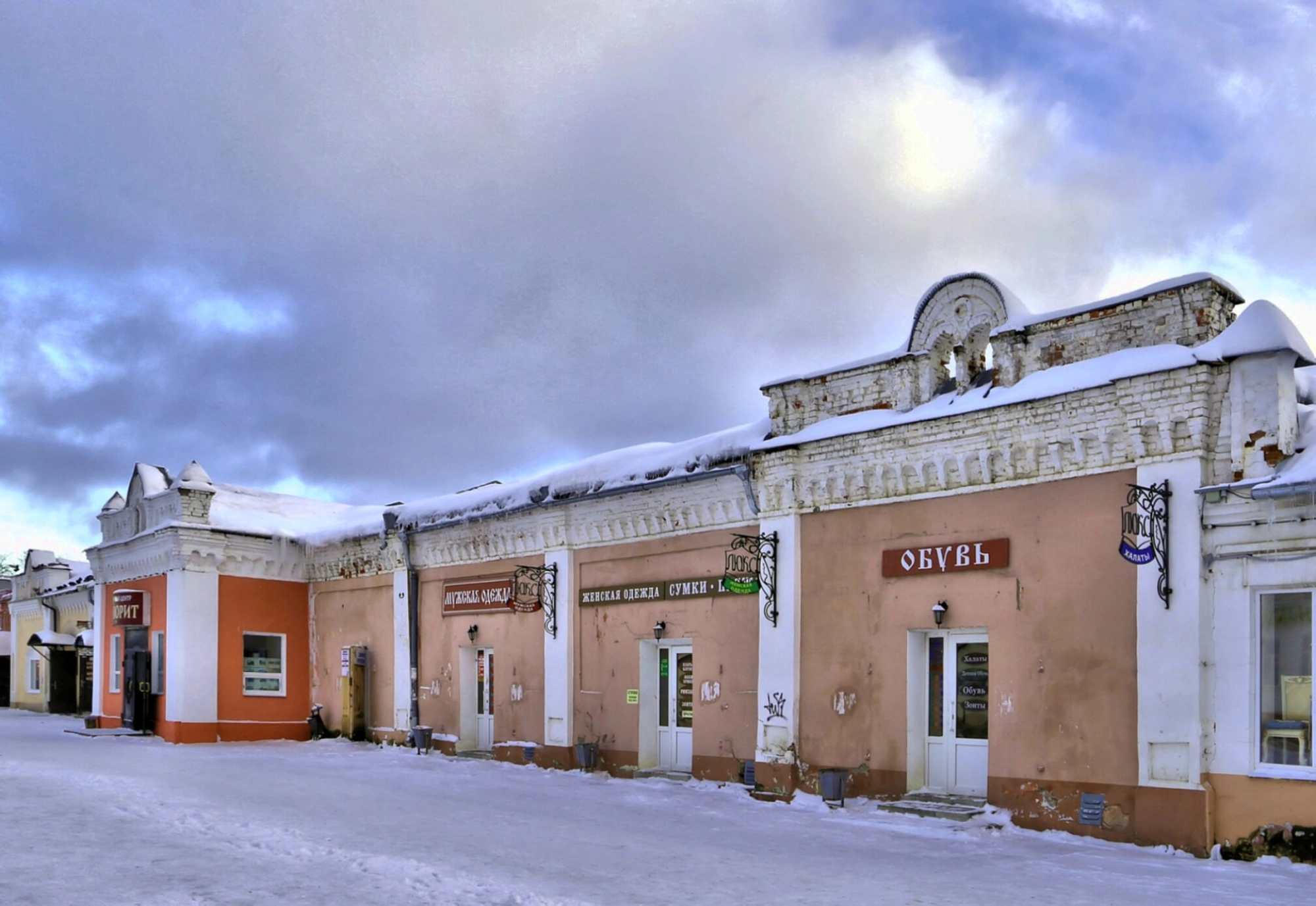 На снимке заметны признаки ветхости строения: местами повреждён фасад, частично осыпалась штукатурка на первом этаже. Эти детали указывают на необходимость реставрационных работ для сохранения святыни. Зимний пейзаж окружает храм снежным покрывалом, слева виднеется оголённое дерево, а над зданием проходят электропровода, что характерно для городского ландшафта.