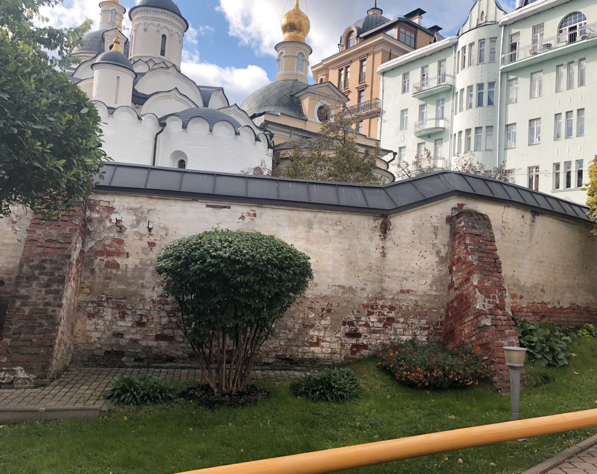 На переднем плане снимка виден фрагмент древней ограды — кирпичная стена, частично покрытая штукатуркой, с признаками благородной патины времени, окружённая скромной зеленью. За ней величественно возвышаются златоглавые купола церкви, увенчанные православными крестами, сияющими в лучах солнца. Чётко просматриваются элементы церковного здания: апсида, барабаны глав и фрагменты фасада, выполненные в характерном для московского зодчества стиле.