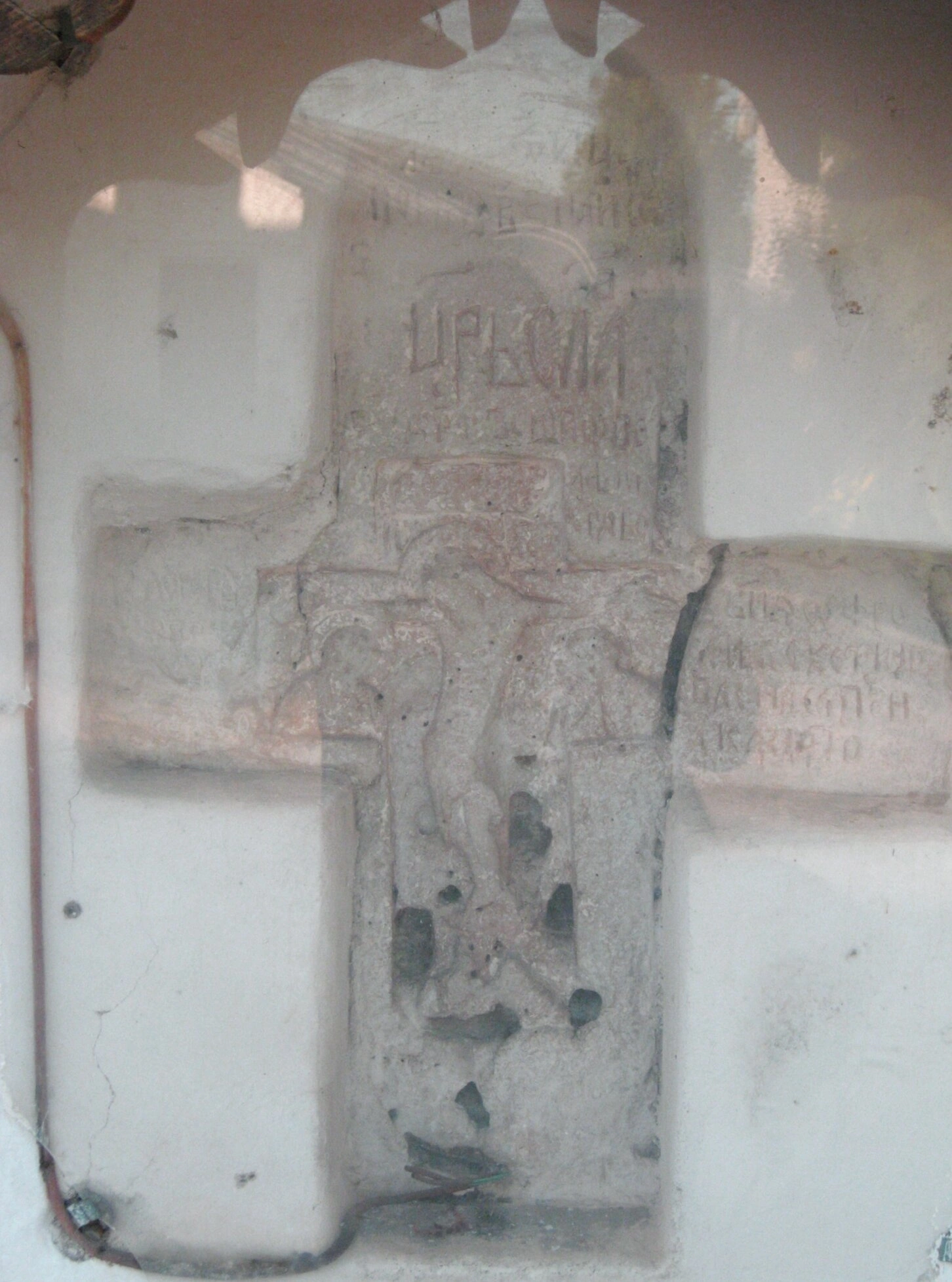 На фотографии запечатлён древний каменный крест с рельефным изображением Распятия, встроенный в стену Церкви Апостола Филиппа и Николая Чудотворца в Великом Новгороде. Этот крест является неотъемлемой частью архитектурного облика и сакрального пространства одного из старейших храмов города. Подобные кресты, размещаемые на внешних стенах, имели не только декоративное, но и глубоко духовное значение, напоминая верующим о искупительной жертве Спасителя и освящая собой всё окружающее пространство.