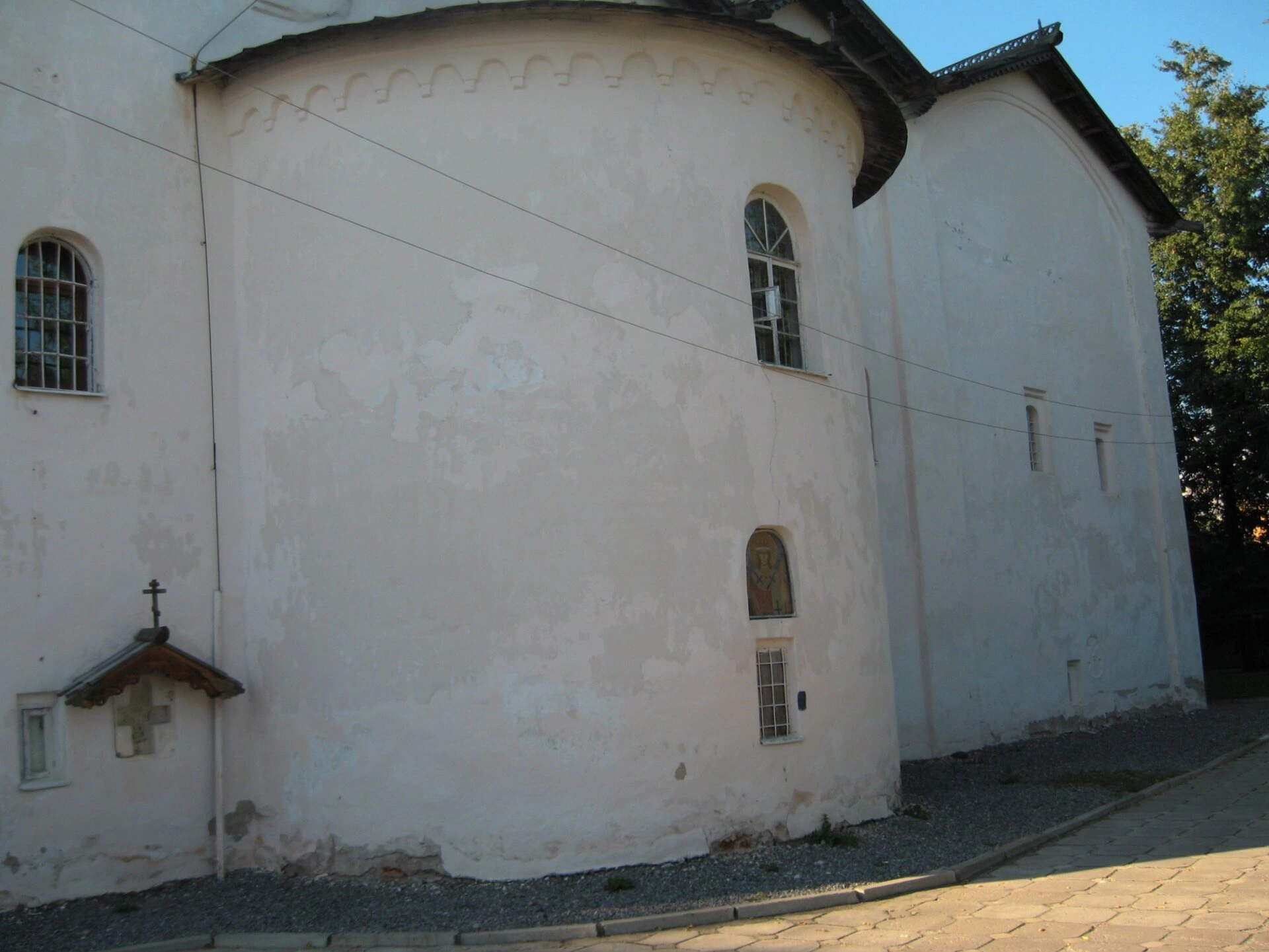 Чётко просматривается характерная для храмовой архитектуры структура: основной объём, увенчанный мощным барабаном и главой, и полукруглые апсиды алтарной части. Фасад украшают скромные, но выразительные арочные окна, освещающие внутреннее пространство церкви. Слева к основному зданию примыкает невысокая пристройка, вероятно, являющаяся поздним приделом или часовней, что свидетельствует о многовековой истории храма и его развитии.