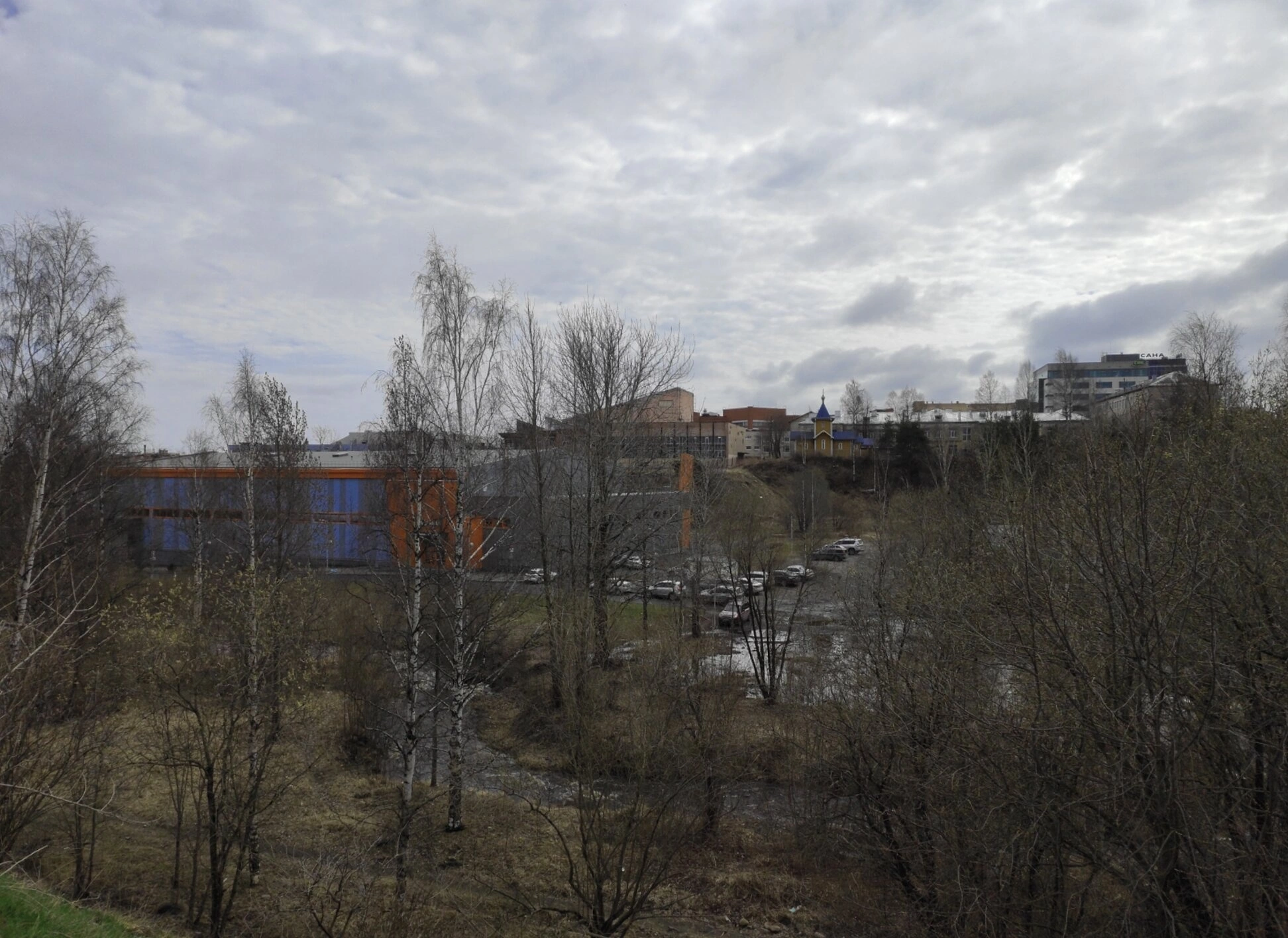 На среднем плане фотографии виднеются жилые здания и припаркованные автомобили, что напоминает о том, что храм находится в самом сердце жилого массива, всегда открытый для своих прихожан. На заднем плане простирается пасмурное карельское небо, столь привычное для этих мест, создающее особое настроение умиротворения и созерцательности.
