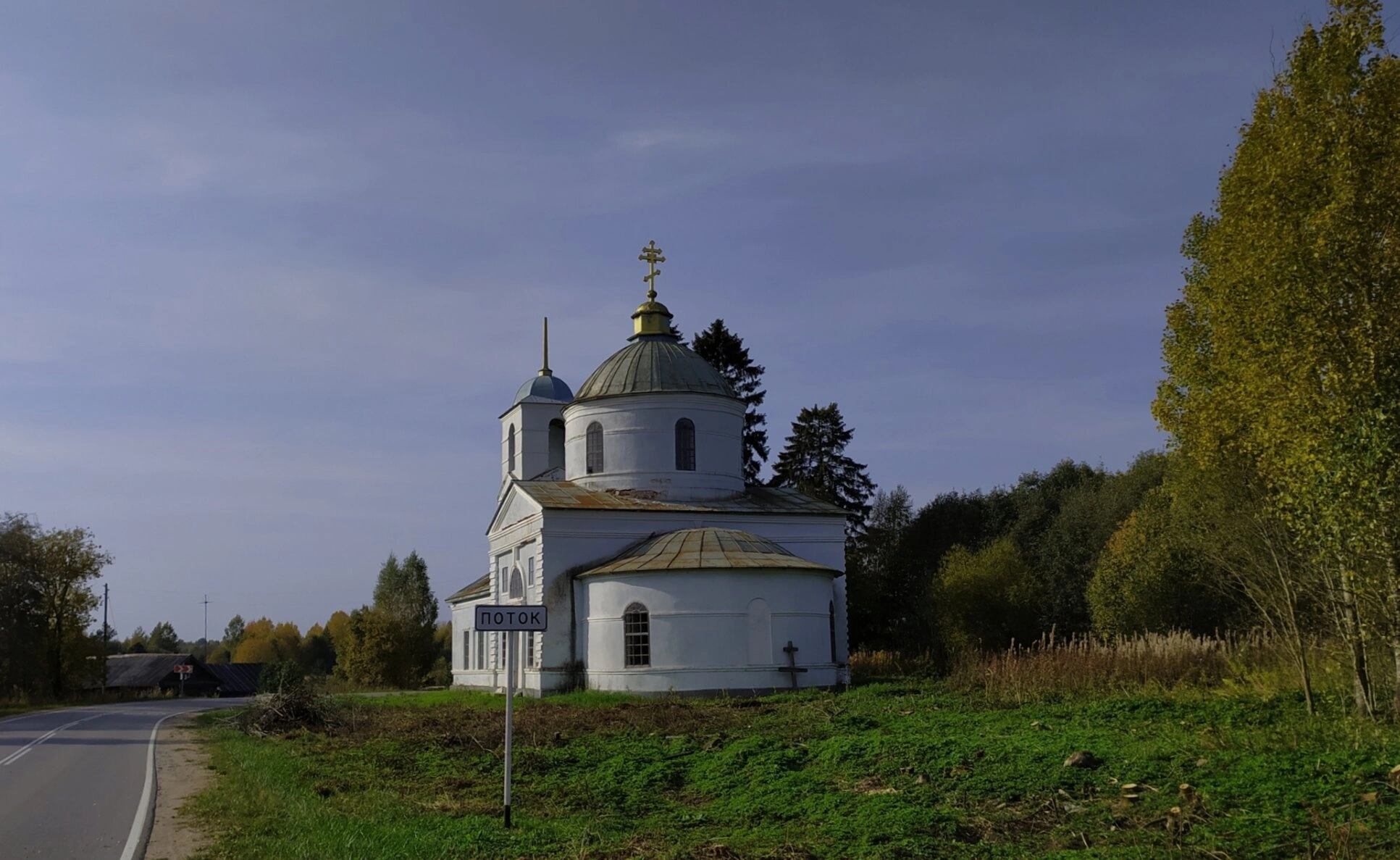 На представленной фотографии запечатлена Церковь Святых Первоверховных Апостолов Петра и Павла, расположенная в деревне Сомино Бокситогорского района Ленинградской области. Храм находится вблизи населённого пункта Поток, что подтверждается указателем, видимым на снимке.