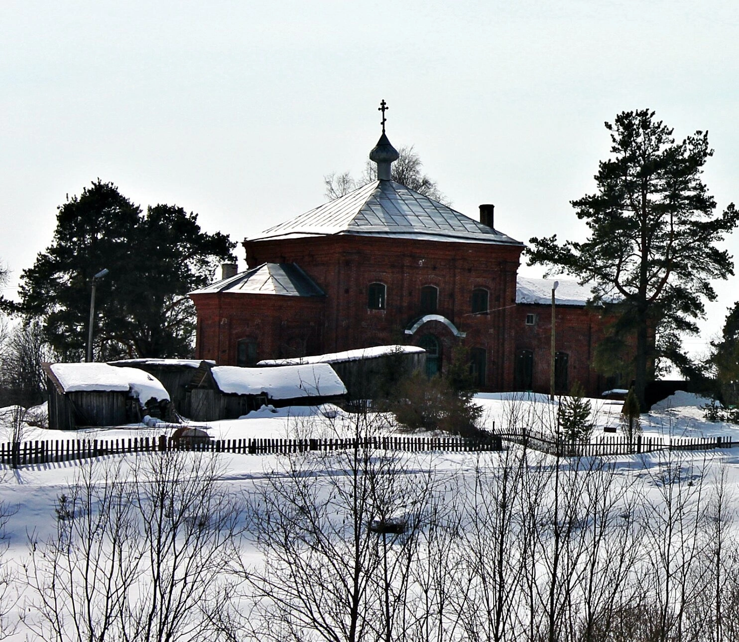 Храм представляет собой кирпичное здание, выполненное в традициях русской церковной архитектуры. Однокупольное завершение строения увенчано святым крестом, символизирующим веру и искупительную жертву Спасителя. Фотография сделана в зимний период, когда снежное покрывало окутывает землю, крыши прихрамовых построек и ветви окружающих деревьев, создавая особую атмосферу благоговейной тишины и умиротворения.
