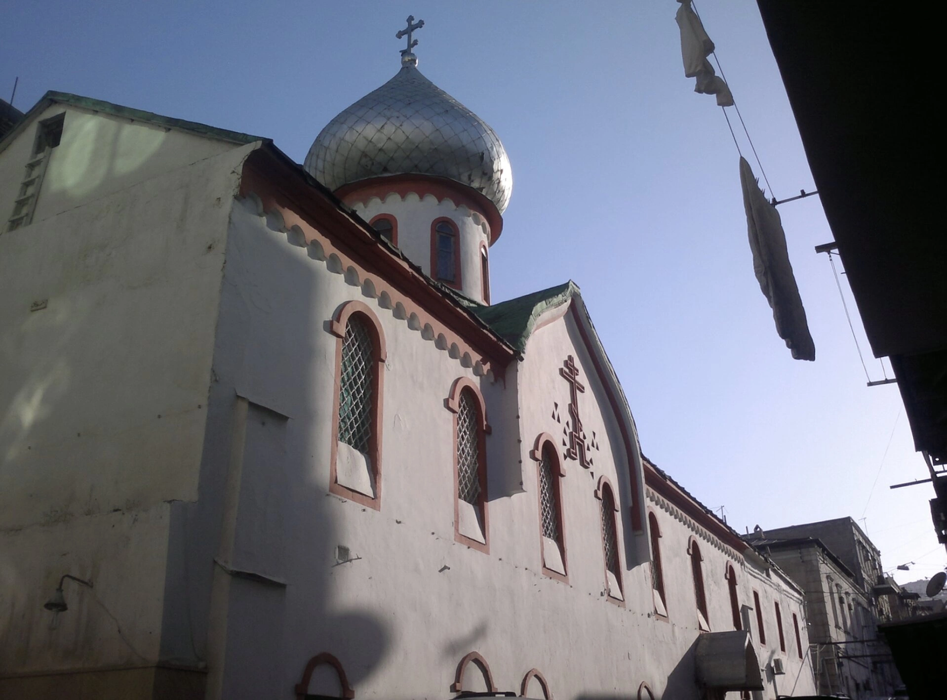С левой стороны к основному объёму храма примыкает церковная постройка, вероятно, являющаяся помещением для служебных нужд или часовней. Окружающий контекст — элементы городской застройки и бытовые детали, такие как сушащееся бельё на верёвке, — создают уникальный контраст между священным и повседневным, подчёркивая, что храм живёт своей жизнью в ритме современного восточного города.