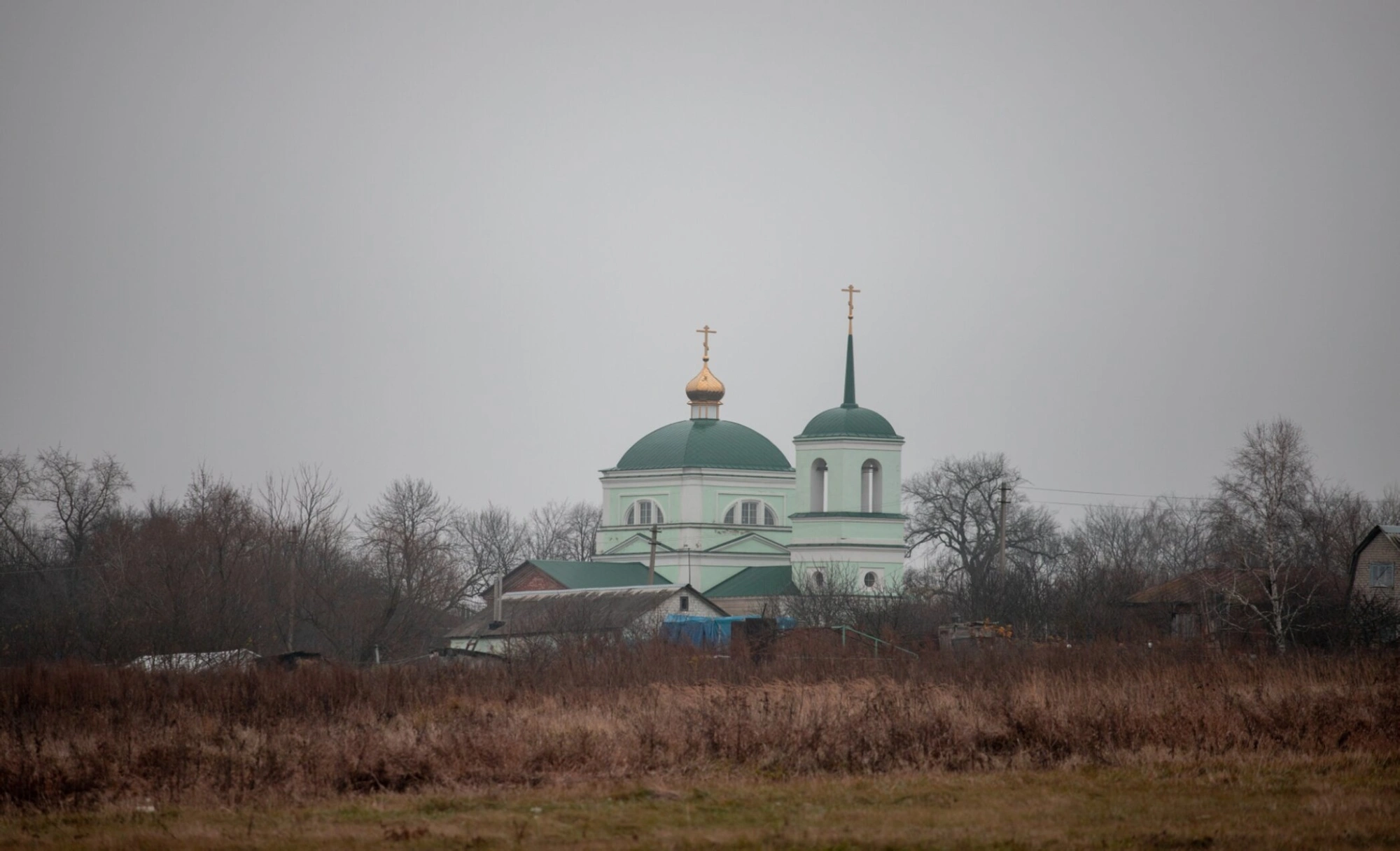 Храм окружён деревьями и кустарниками, находящимися в осенне-зимнем состоянии. На переднем плане видно поле с пожухлой травой коричнево-жёлтых оттенков. На заднем плане просматриваются крыши других строений и линии электропередачи на столбах.