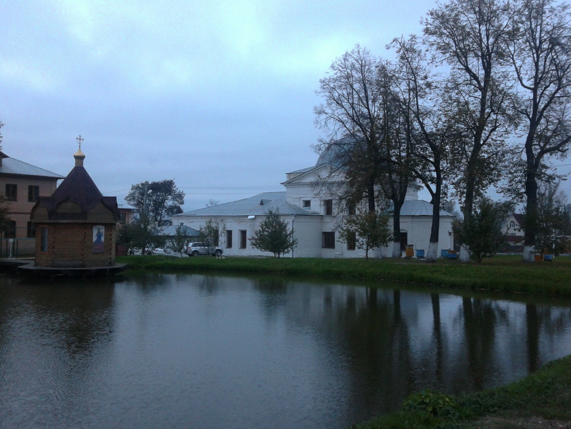 Особую живописность композиции придаёт расположенный перед церковью водоём, на берегу которого установлена небольшая деревянная часовня, также увенчанная крестом. Осенние деревья с золотистой листвой обрамляют храмовый комплекс, создавая гармоничный природный фон. Пасмурное небо с облаками добавляет снимку особое настроение умиротворённости и духовной сосредоточенности. Исторически данный храм является значимым памятником культурного наследия Одинцовского района и центром духовной жизни местной православной общины.