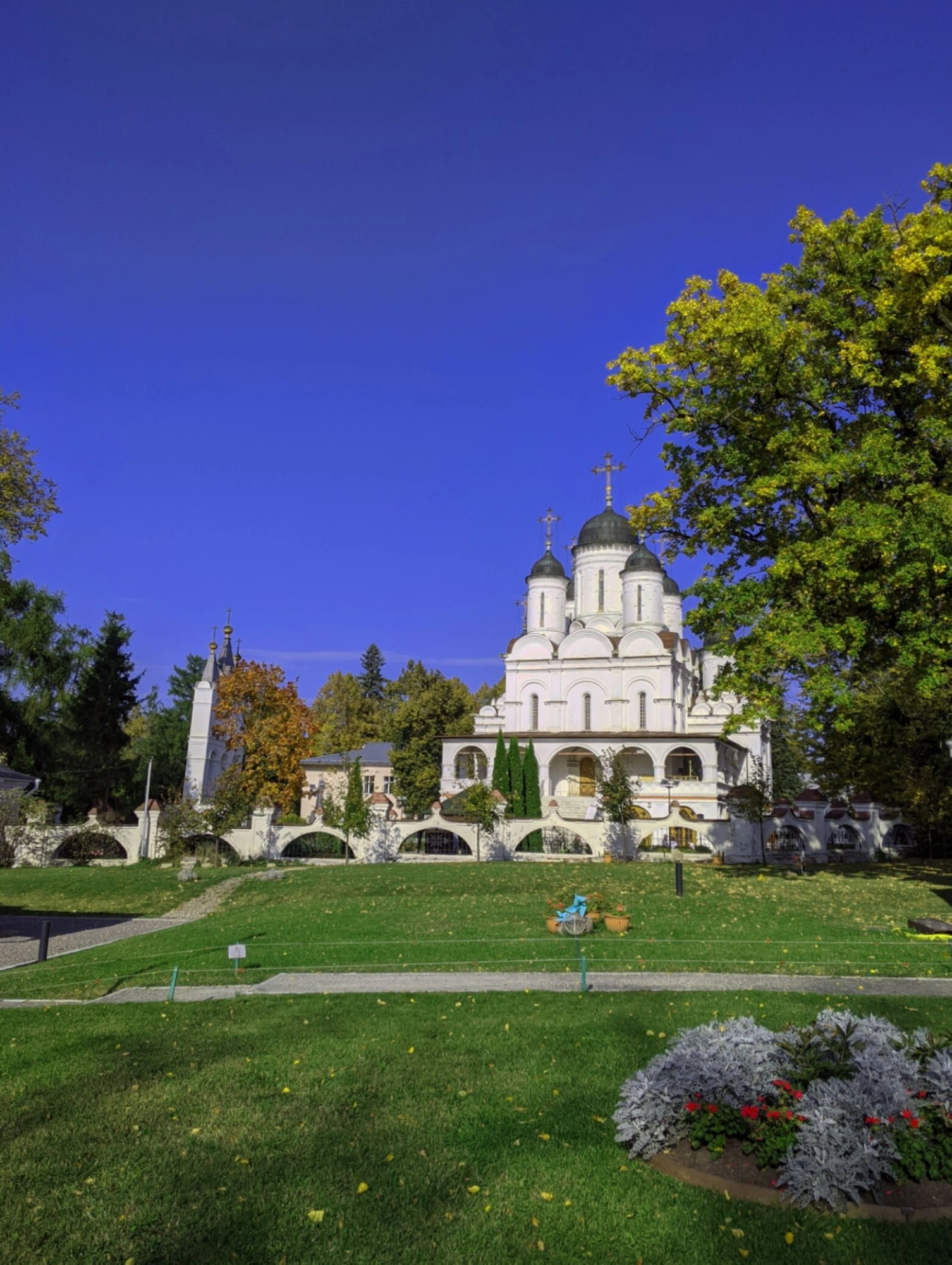 Храмовая территория благоустроена и ухожена, что свидетельствует о заботливом отношении прихожан к своей святыне. Зелёный газон и аккуратные дорожки создают опрятный вид. По периметру церковного двора растут деревья, одетые в осенний убор из золотистой и зелёной листвы, что придаёт особое очарование и умиротворение всему пейзажу. С правой стороны от храма видна цветущая клумба, добавляющая ярких красок в общую картину.