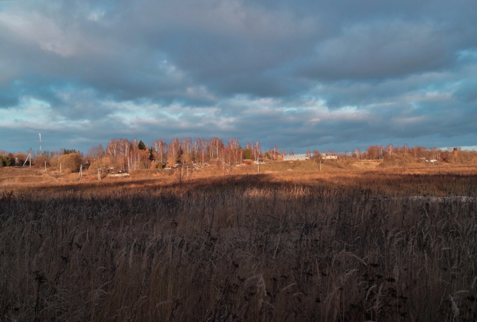 Передний план композиции занимает поле с пожухлой травой, что свидетельствует о съёмке в осенний период либо ранней весной, когда природа ещё не пробудилась от зимнего сна. Через средний план простирается полоса лиственного леса, где особо выделяются белоствольные берёзы – символ русской природы. За древесными массивами просматриваются очертания церковных строений, куполов и крестов, увенчивающих дом божий.