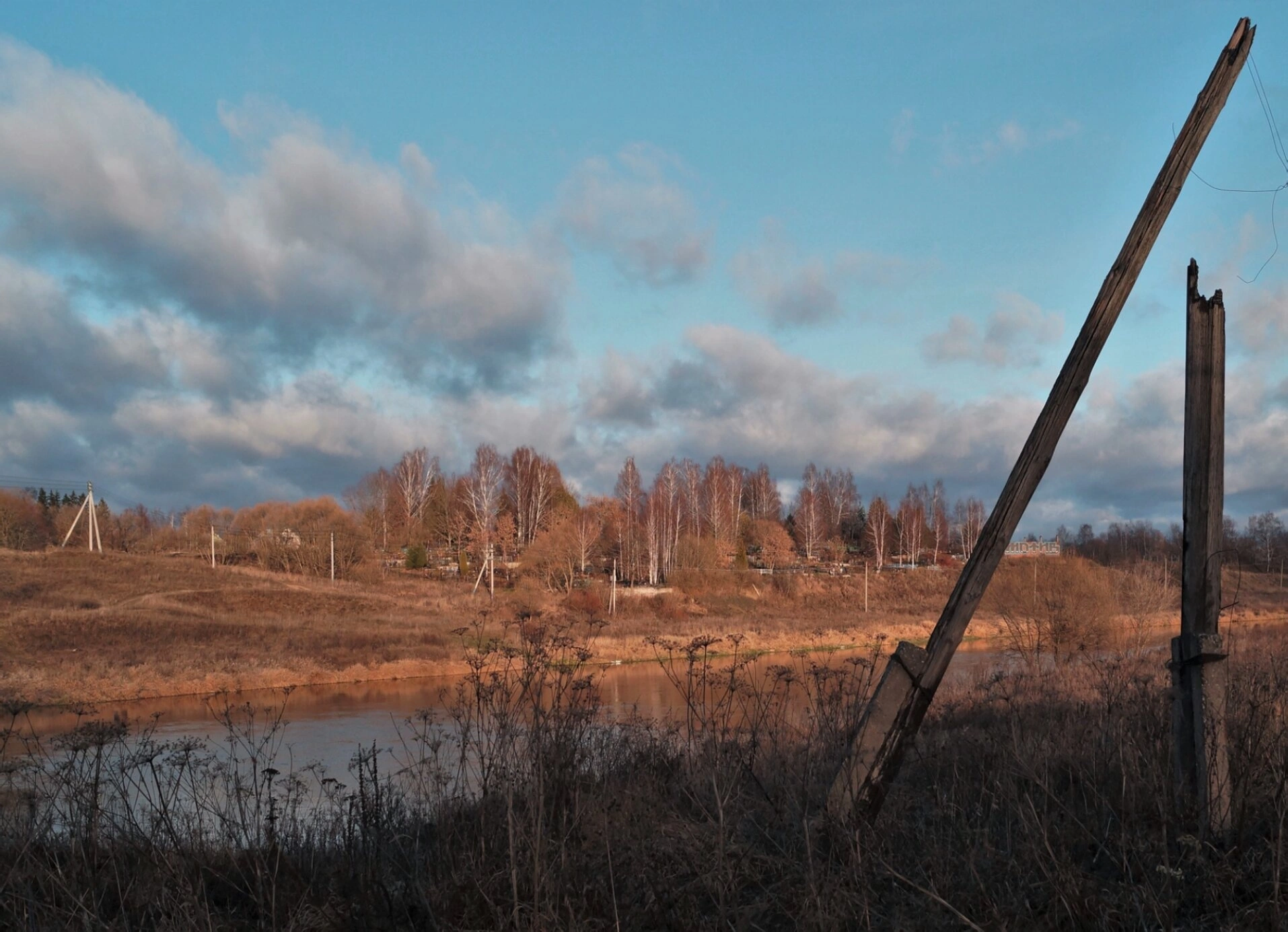 На переднем плане фотографии видна спокойная гладь реки Москвы, обрамленная поросшими кустарником берегами. Справа заметны фрагменты старых деревянных сооружений, вероятно, остатки причальных конструкций или иных речных построек. По центру композиции возвышается белокаменная Церковь Архангела Михаила, чей стройный силуэт гармонично вписывается в окружающий ландшафт.