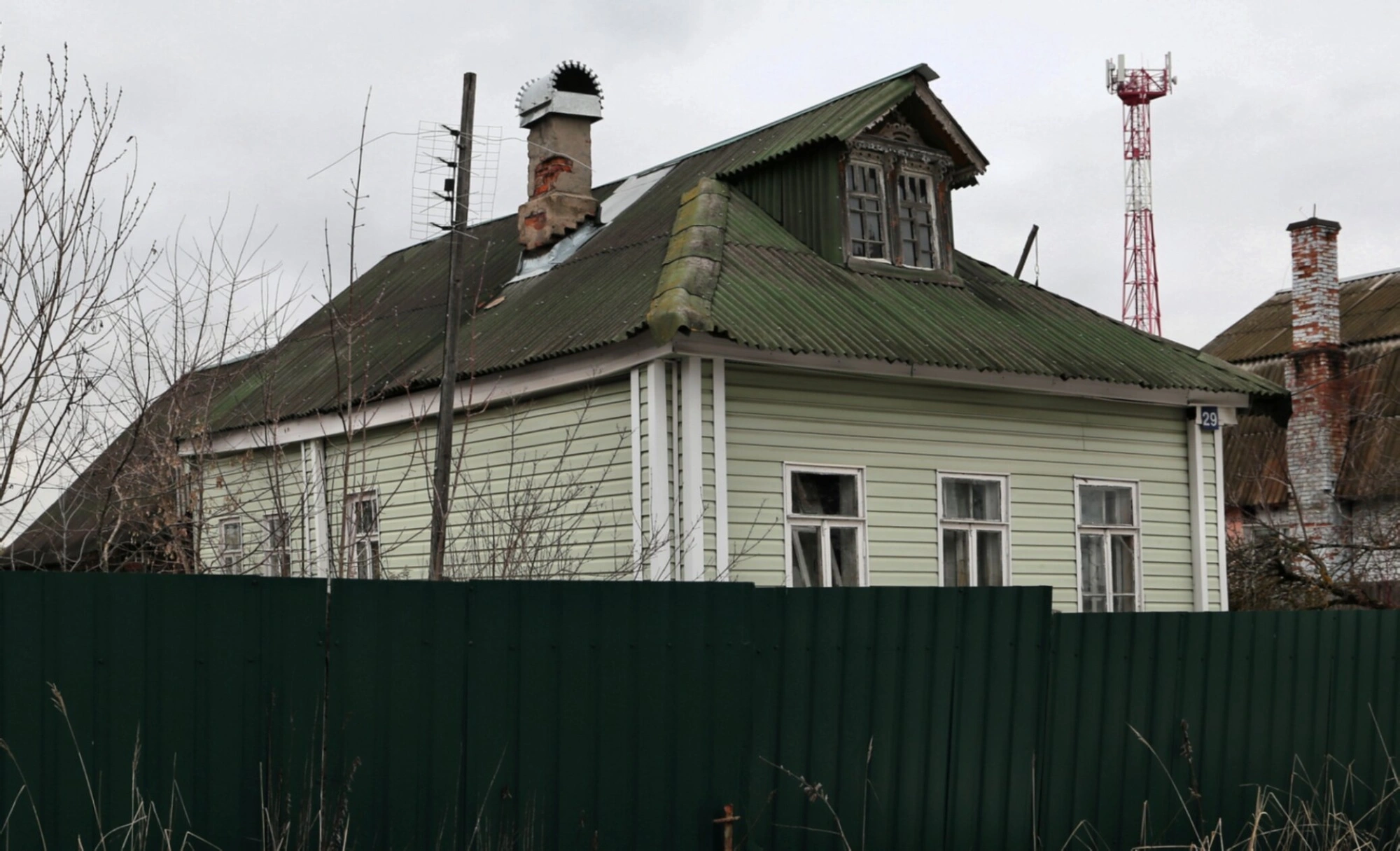 Перед святым местом установлен оградительный забор из темно-зеленого профнастила, отделяющий церковную территорию от окружающего пространства. На заднем плане фотографии просматриваются другие сооружения - кирпичная труба и высокая вышка сотовой связи, свидетельствующие о соседстве исторического храма с современными постройками.
