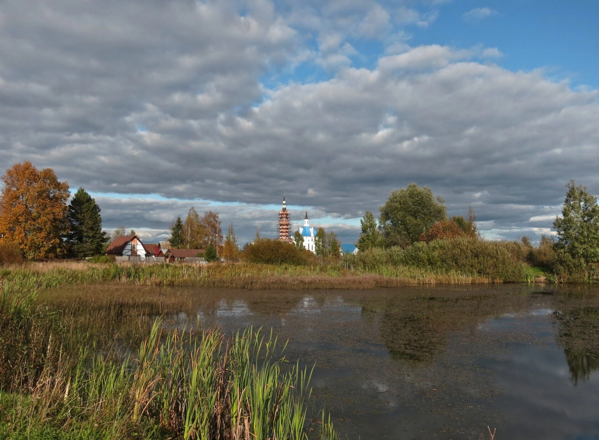 Передний план композиции занимает водная гладь, в которой как в зеркале отражаются небесные просторы и стройный силуэт храма. Прибрежная растительность с камышами и высокой травой обрамляет водоём, добавляя пейзажу естественной красоты. На дальнем плане виднеются деревенские дома и деревья с осенней листвой, создающие атмосферу умиротворённости и покоя.