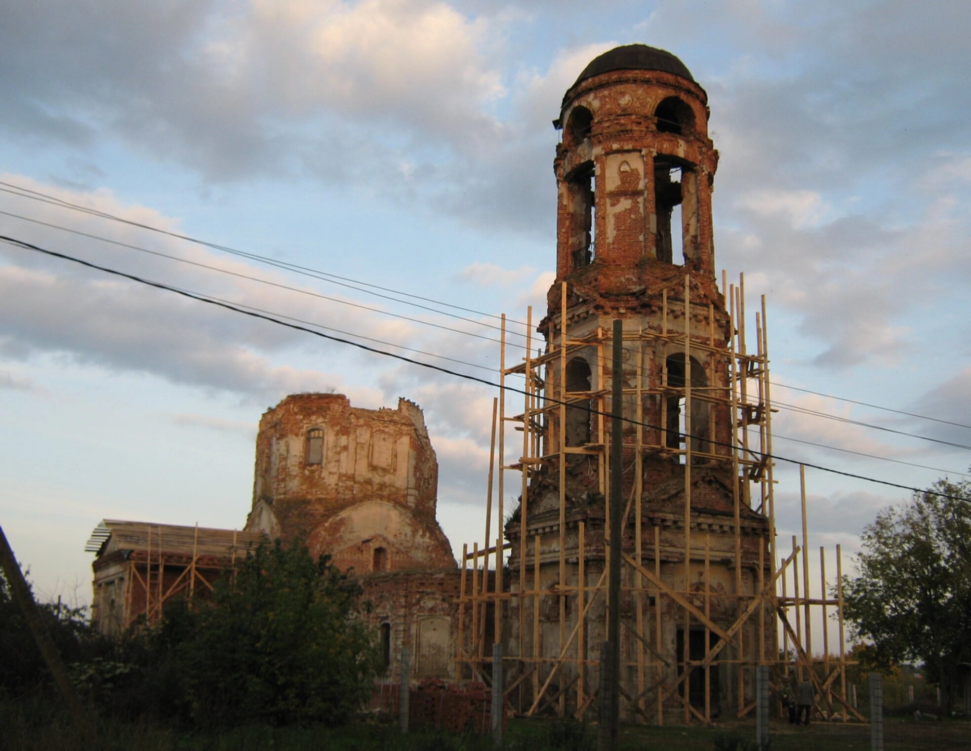 На снимке отчетливо видна многоярусная колокольня, которая в момент съемки была окружена деревянными строительными лесами. Это свидетельствует о ведущихся работах по её консервации или реставрации, что вселяет надежду на сохранение исторического облика сооружения. Основной же объём храма, к сожалению, демонстрирует сильные разрушения: утрачены кровля, завершения, значительная часть стеновых конструкций осыпалась.