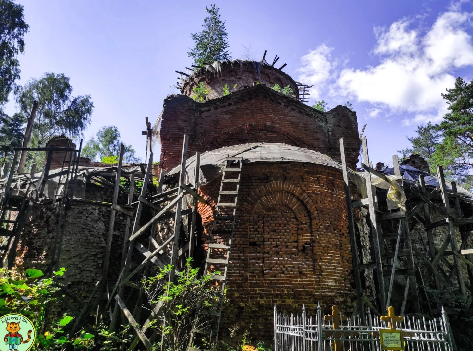 Вокруг храмовой постройки возведены деревянные строительные леса, что вселяет надежду на возможное возрождение святыни. Эти временные конструкции из грубо обработанных брёвен символизируют заботу о сохранении памятника православной культуры для будущих поколений.