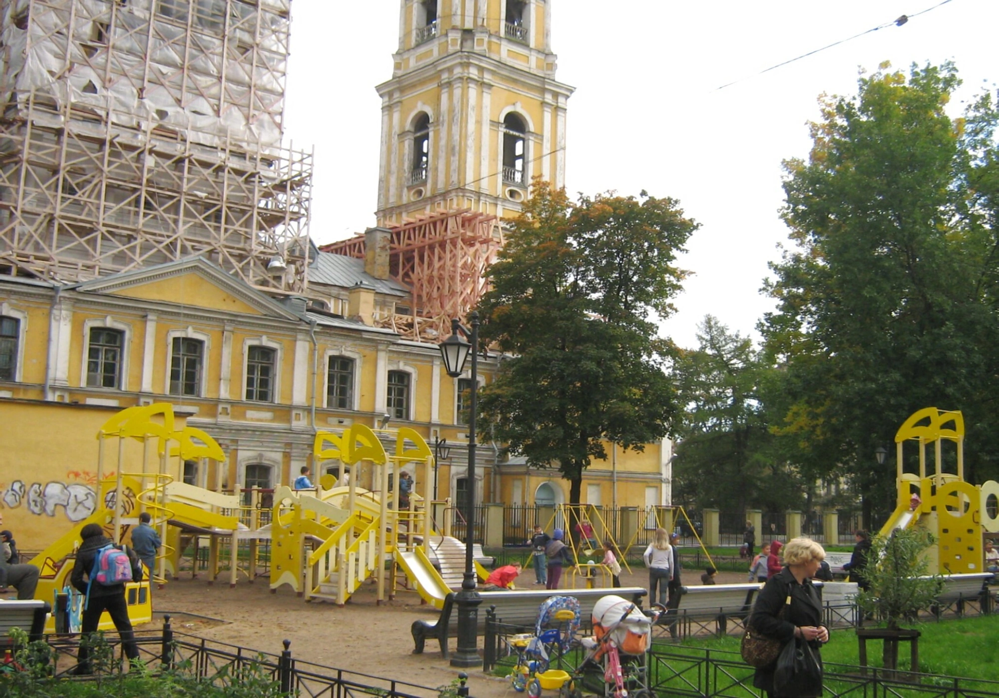 Перед историческим зданием, на переднем плане, раскинулась современная детская площадка с ярким игровым оборудованием. Этот контраст глубоко символичен: он говорит о том, что древний храм — не музейный экспонат, а живой организм, центр приходской жизни, открытый для людей всех возрастов. Дети, играющие здесь под сенью зелёных деревьев, — это будущее общины, а спокойствие взрослых, наблюдающих за ними со скамеек, — свидетельство мира, обретаемого в ограде церковной. Присутствие детских колясок, людей, уличного фонаря и ограды, отделяющей этот уголок мира от городской суеты, создаёт образ уюта и покоя, что особенно ценно в сердце большого города.