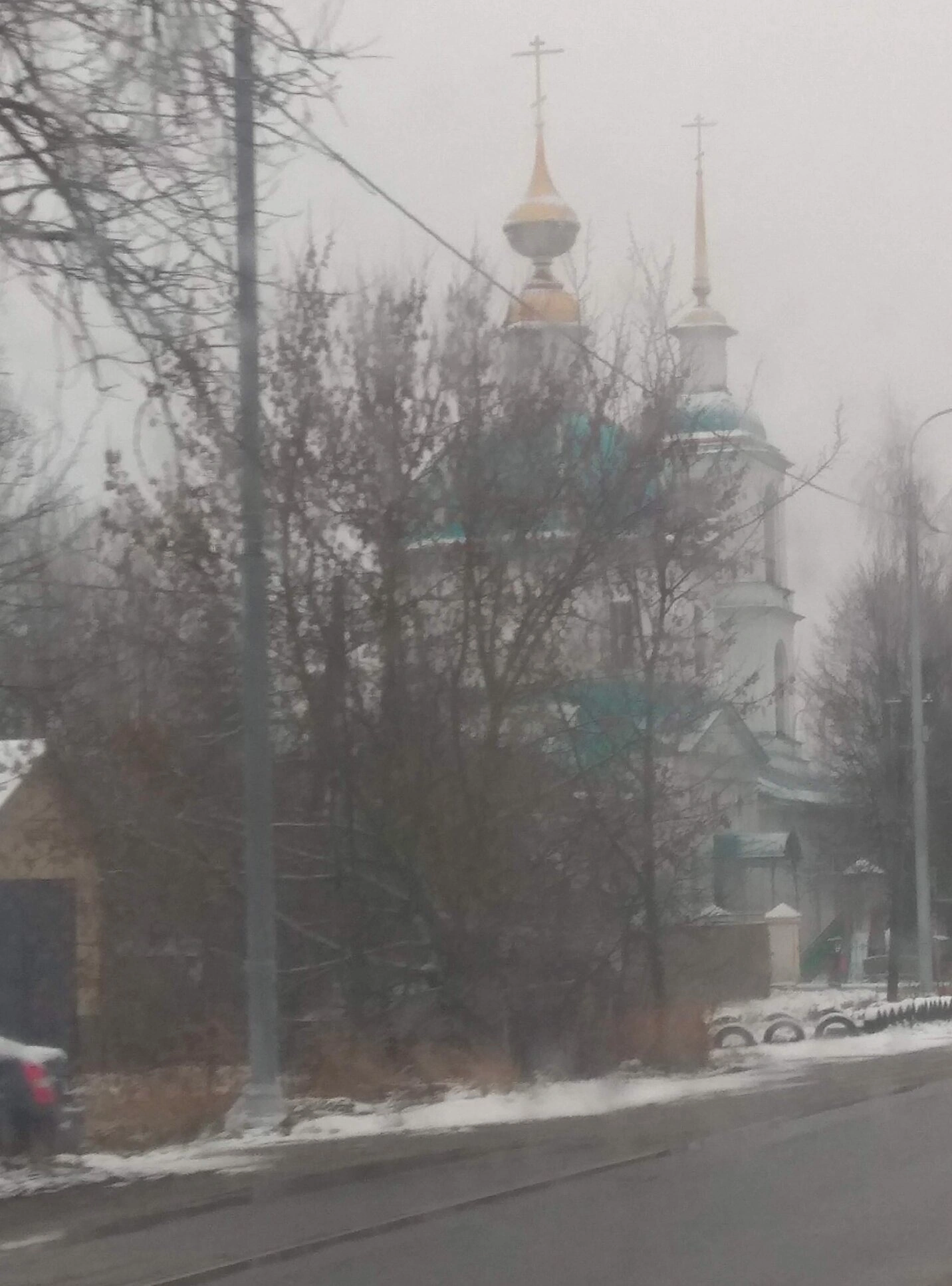 Снимок сделан в холодное время года, о чём свидетельствуют деревья без листвы и заснеженная земля. Туманная погода создаёт особую атмосферу умиротворения и духовной сосредоточенности, характерную для православных святынь. На переднем плане фотографии видна заснеженная обочина дороги, часть автомобиля и уличный столб, что указывает на современный контекст существования исторического храма.