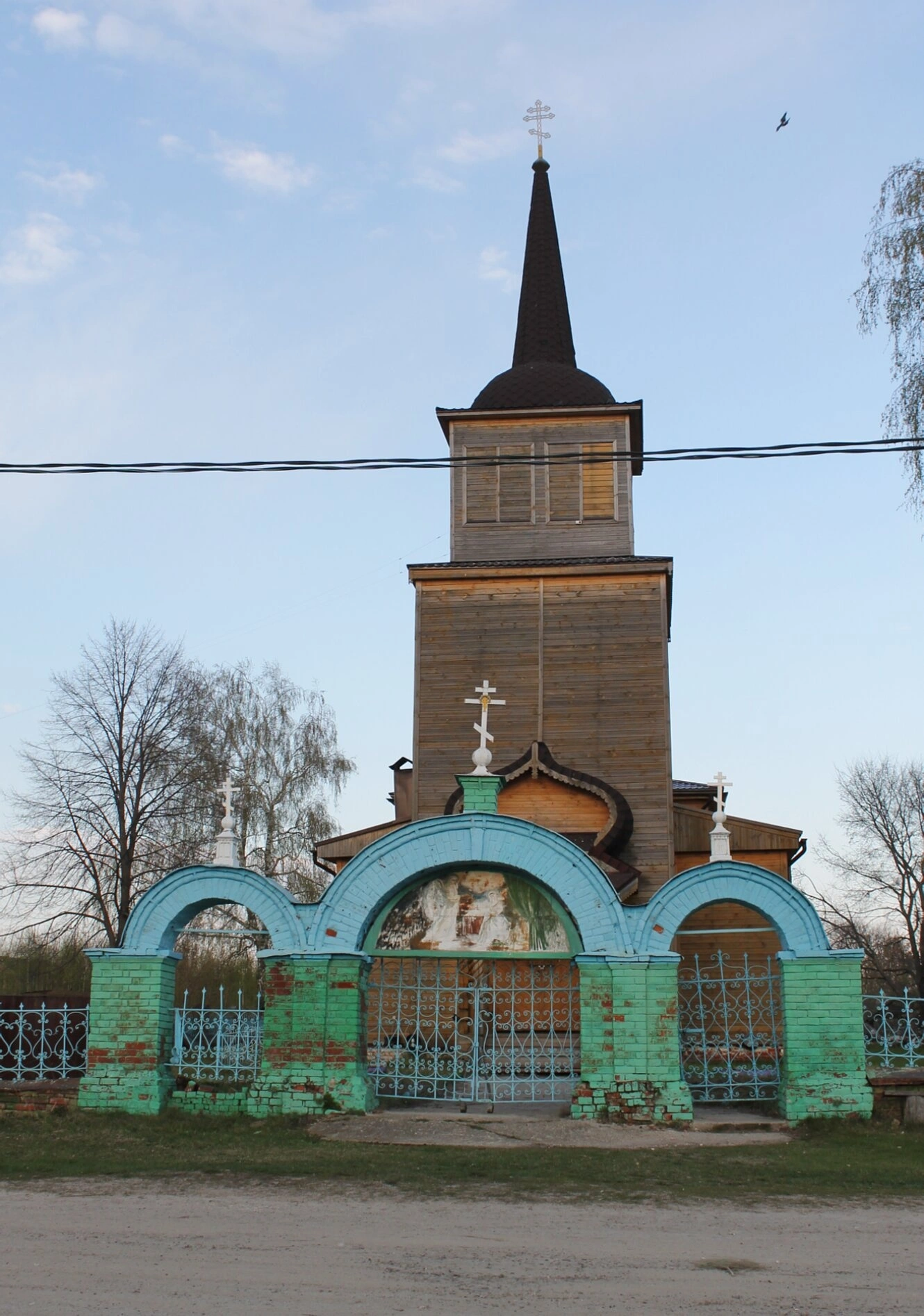 На представленной фотографии запечатлена величественная деревянная церковь Благовещения Пресвятой Богородицы, расположенная в старинном селе Разнежье. Храмовой комплекс включает в себя основное здание и высокую колокольню, увенчанную куполом со стройным шпилем, на котором вознесён православный восьмиконечный крест, сияющий в лучах благодатного света.