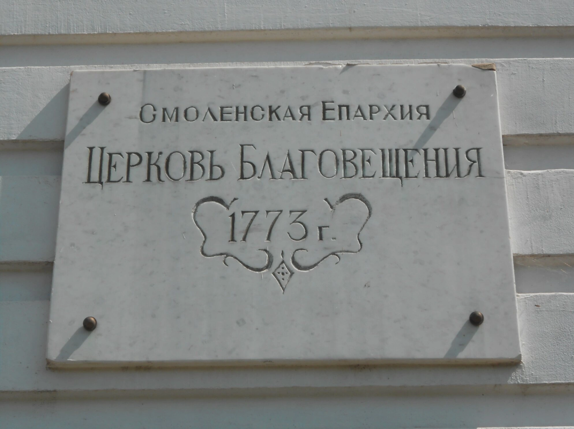На фотографии запечатлена мемориальная табличка, установленная на фасаде исторического православного храма в Смоленске. Белая плита содержит выгравированную надпись: «СМОЛЕНСКАЯ ЕПАРХИЯ», «ЦЕРКОВЬ БЛАГОВЕЩЕНИЯ» и дату «1773 г.», обозначающую год основания святыни. Декоративное оформление таблички отражает церковно-архитектурные традиции русского классицизма.