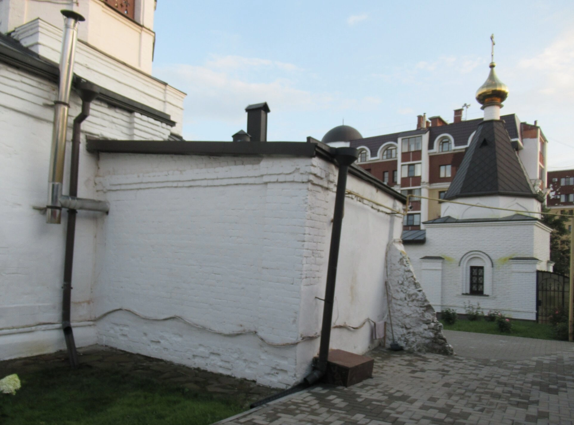 Водосточная система храма представлена металлическими трубами, закрепленными на стенах, которые обеспечивают отвод осадков с крыши. Кровля здания покрыта темным материалом, на которой расположена дымовая труба. Купол, сияющий золотым покрытием, является архитектурной доминантой комплекса и виден издалека.
