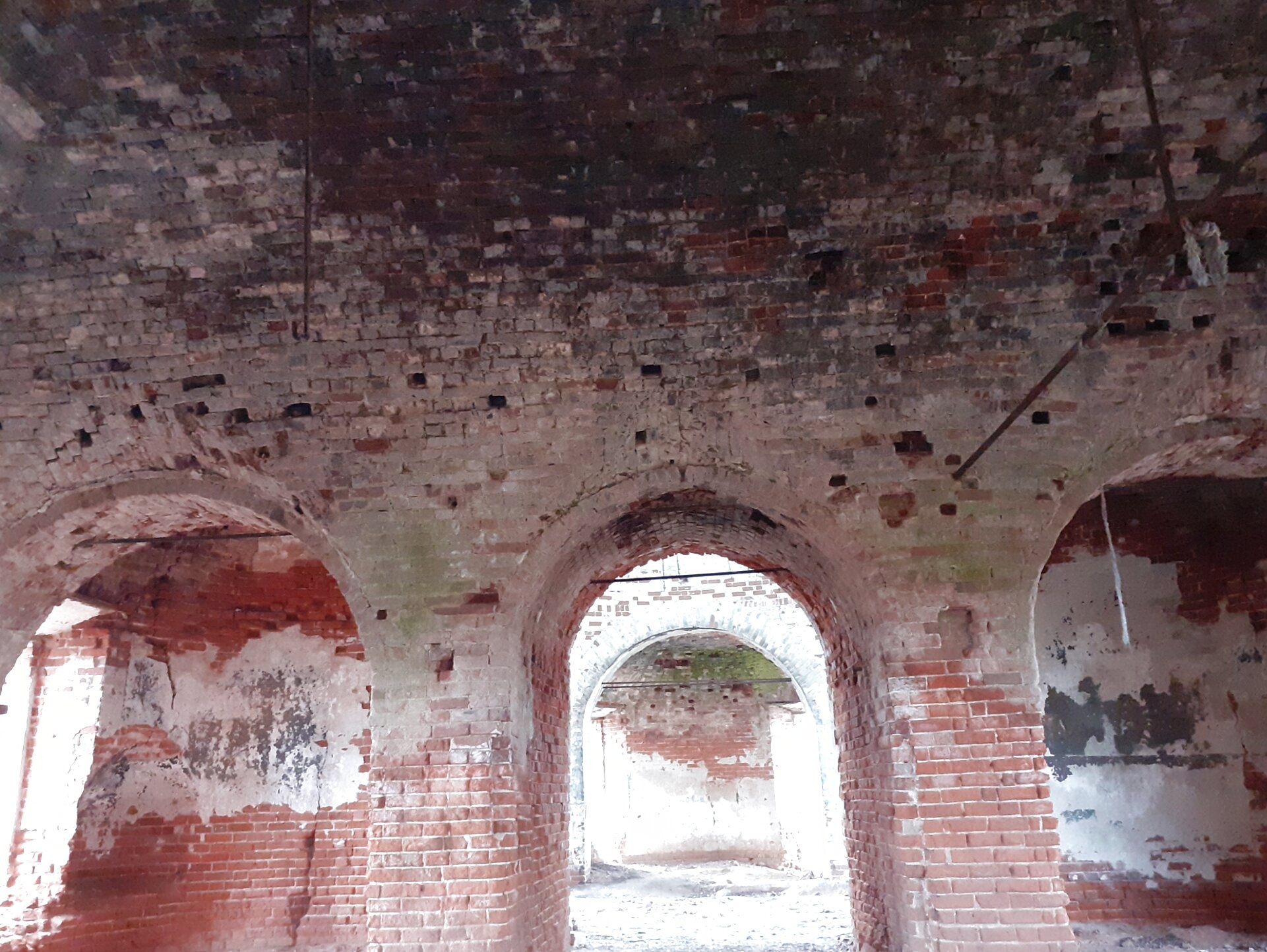 На снимке видны элементы внутреннего убранства храма, сохранившиеся несмотря на все исторические перипетии. Мощные кирпичные стены, арочные проемы и сводчатые перекрытия демонстрируют характерные черты классицизма в церковной архитектуре. Эти архитектурные детали создают особое молитвенное пространство, даже пребывая в поврежденном состоянии.