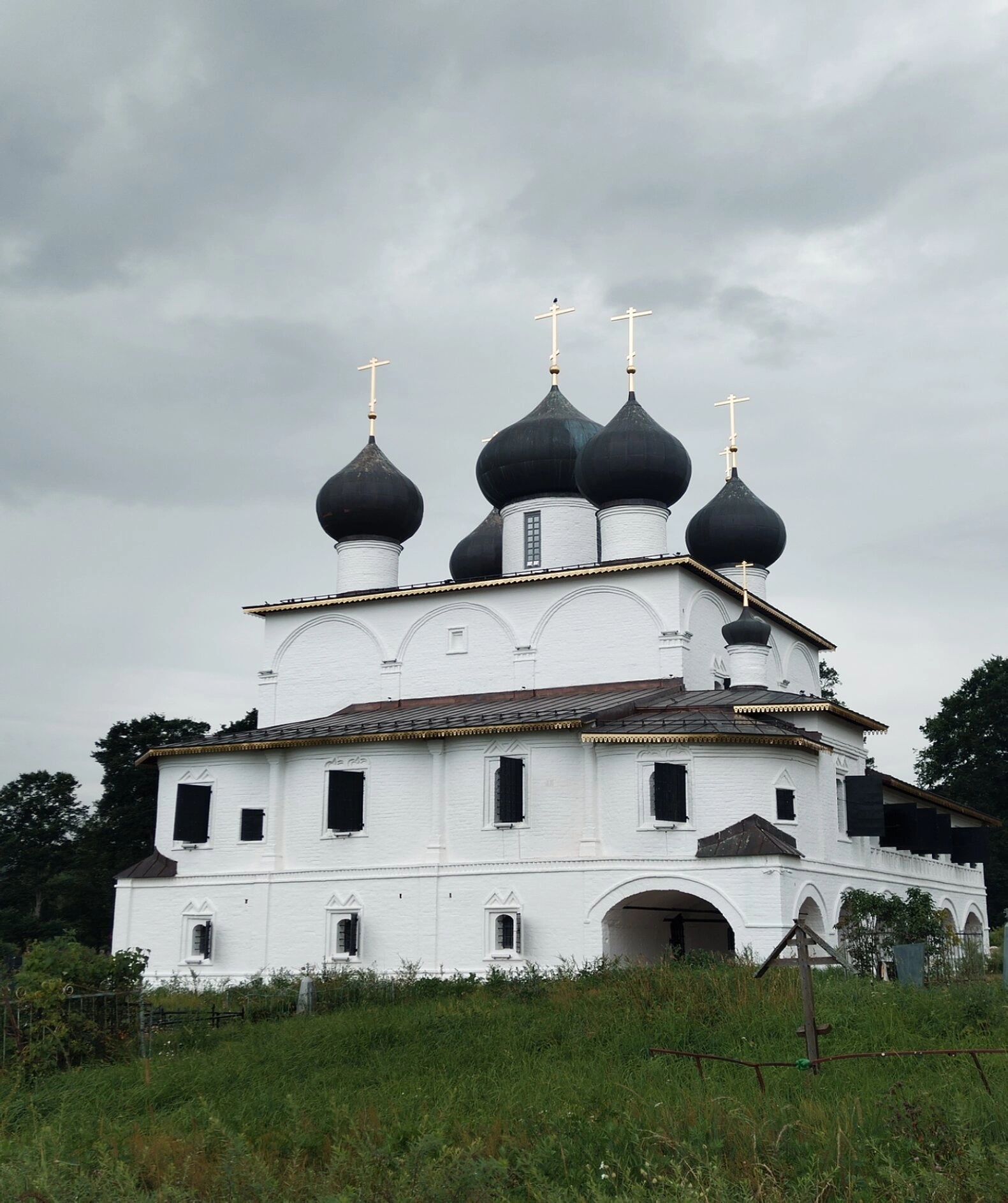 Храм гармонично вписан в окружающий пейзаж. Он стоит на возвышении, окружённый зелёными лугами и деревьями, что подчёркивает его величие и духовную высоту. Пасмурное небо на фотографии добавляет образу торжественности и величия, напоминая о вечности и бренности земного бытия. Церковь Богоявления на Острову продолжает быть действующим храмом и местом паломничества для верующих, чтущих память святого праведного воина Феодора Ушакова.
