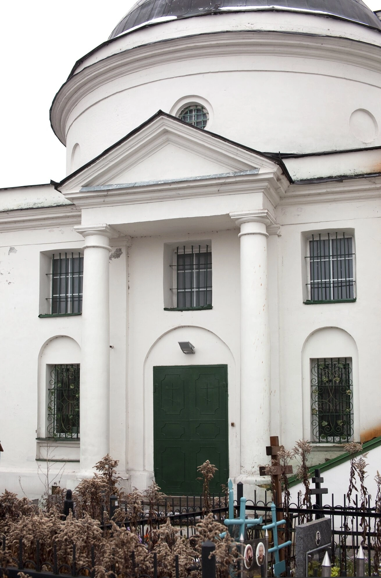 При внимательном рассмотрении на фотографии видны следы времени, оставившие свои отпечатки на стенах святой обители. Некогда белоснежные стены потемнели, однако это не умаляет духовной силы и исторической ценности памятника. На переднем плане просматриваются элементы церковной ограды и намогильные кресты, свидетельствующие о наличии прихрамового кладбища – неотъемлемой части многих старинных погостов.