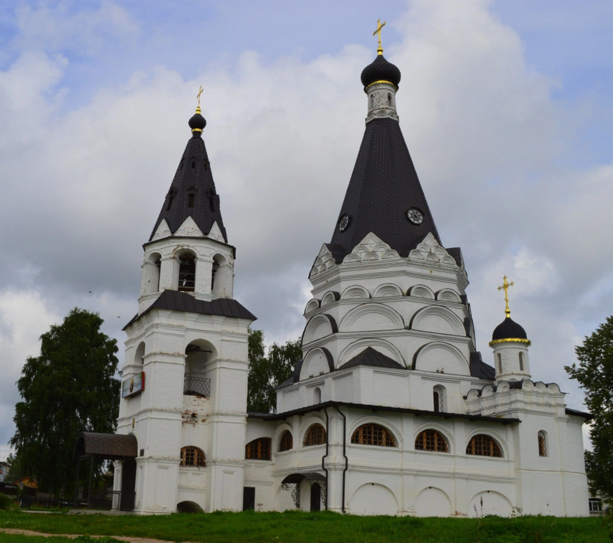На представленной фотографии запечатлён величественный православный храм — Церковь Богоявления Господня, расположенная в старинном селе Красное-на-Волге Костромской области. Этот уникальный памятник каменного зодчества конца XVI века, возведённый в 1592 году по повелению царя Бориса Годунова, является объектом культурного наследия федерального значения.