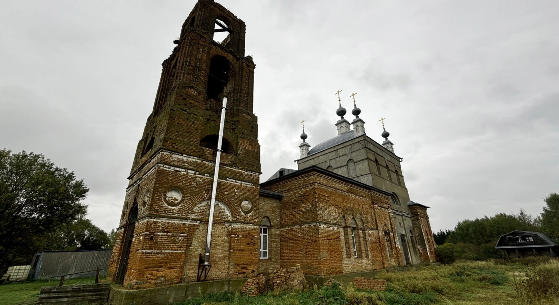 Слева от церковного здания просматривается фрагмент металлического ограждения, справа – небольшая деревянная хозяйственная постройка. Серое пасмурное небо создает меланхоличное настроение, подчеркивая историческую судьбу этого духовного места. Несмотря на запустение, храм сохраняет величие православной архитектуры и продолжает напоминать о многовековых традициях русского церковного зодчества.