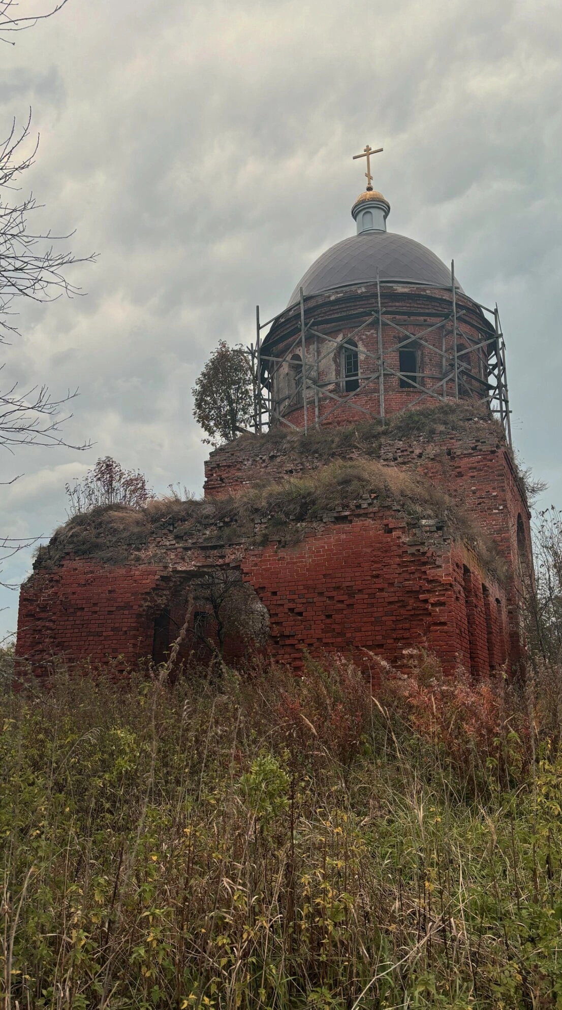 На представленной фотографии запечатлена Церковь Богоявления Господня, расположенная в селе Парфёново Сергиево-Посадского района Московской области. Храм находится в полуразрушенном состоянии, что свидетельствует о непростой истории православной святыни. Кирпичные стены, сохранившие следы былого величия, окружены высокой травой и кустарником, создающими атмосферу заброшенности и одновременно надежды на возрождение.