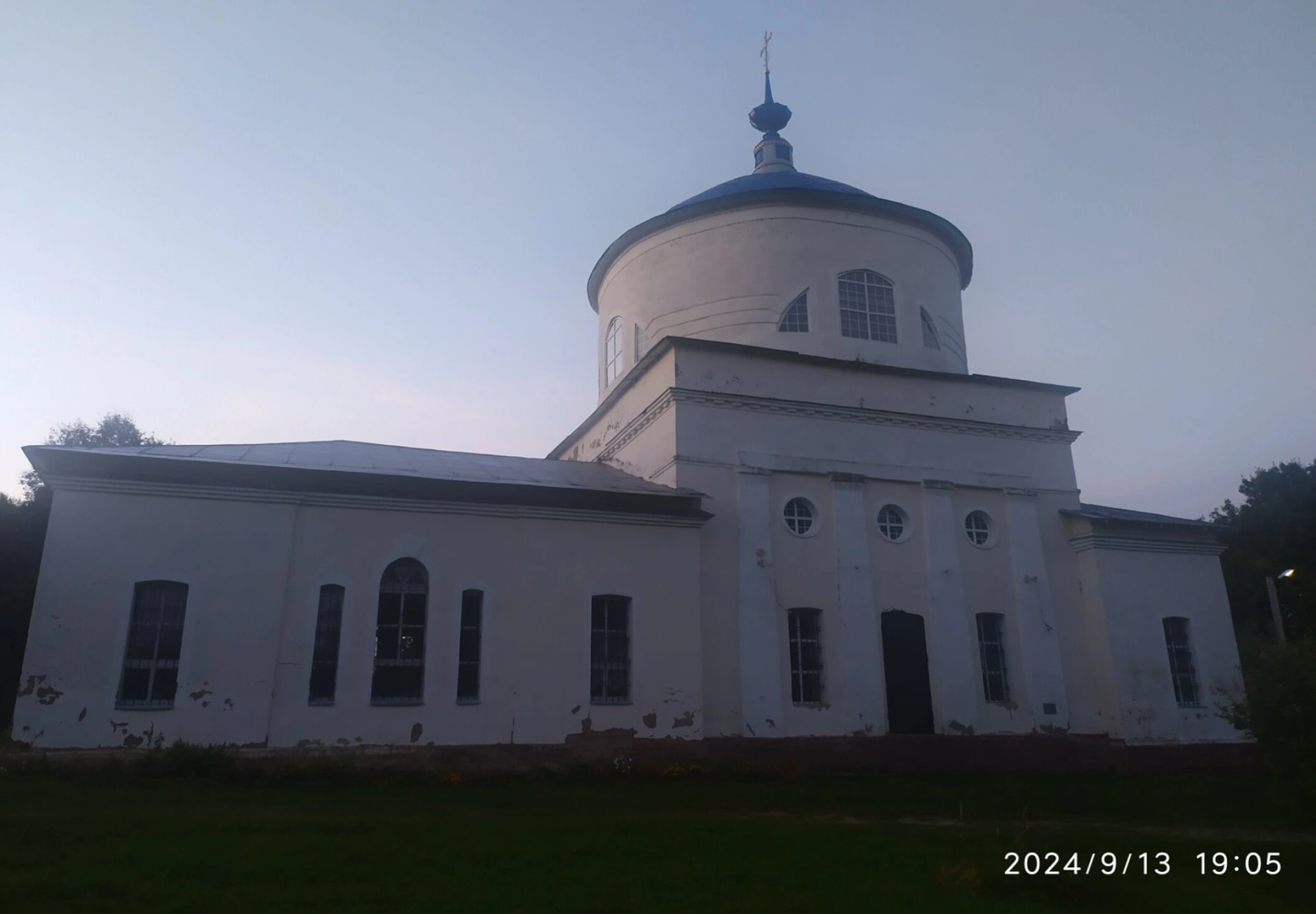 На представленной фотографии запечатлена Церковь Богоявления Господня, расположенная в деревне Парфёново Сергиево-Посадского городского округа Московской области. Снимок выполнен в вечернее время 13 сентября 2024 года, что придаёт архитектурному ансамблю особую духовную атмосферу.