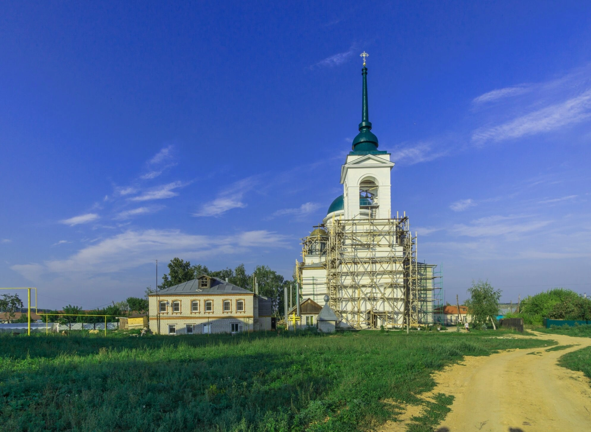 Церковь Богоявления представляет собой каменный храм, построенный в традициях русской церковной архитектуры. Основной объем завершается массивным световым барабаном, увенчанным луковичной главой. Высокая многоярусная колокольня, соединенная с основным зданием трапезной частью, демонстрирует характерные для православного зодчества формы. В момент съемки колокольня и часть фасада находятся в строительных лесах, что свидетельствует о проведении реставрационных работ по сохранению этого духовного наследия.