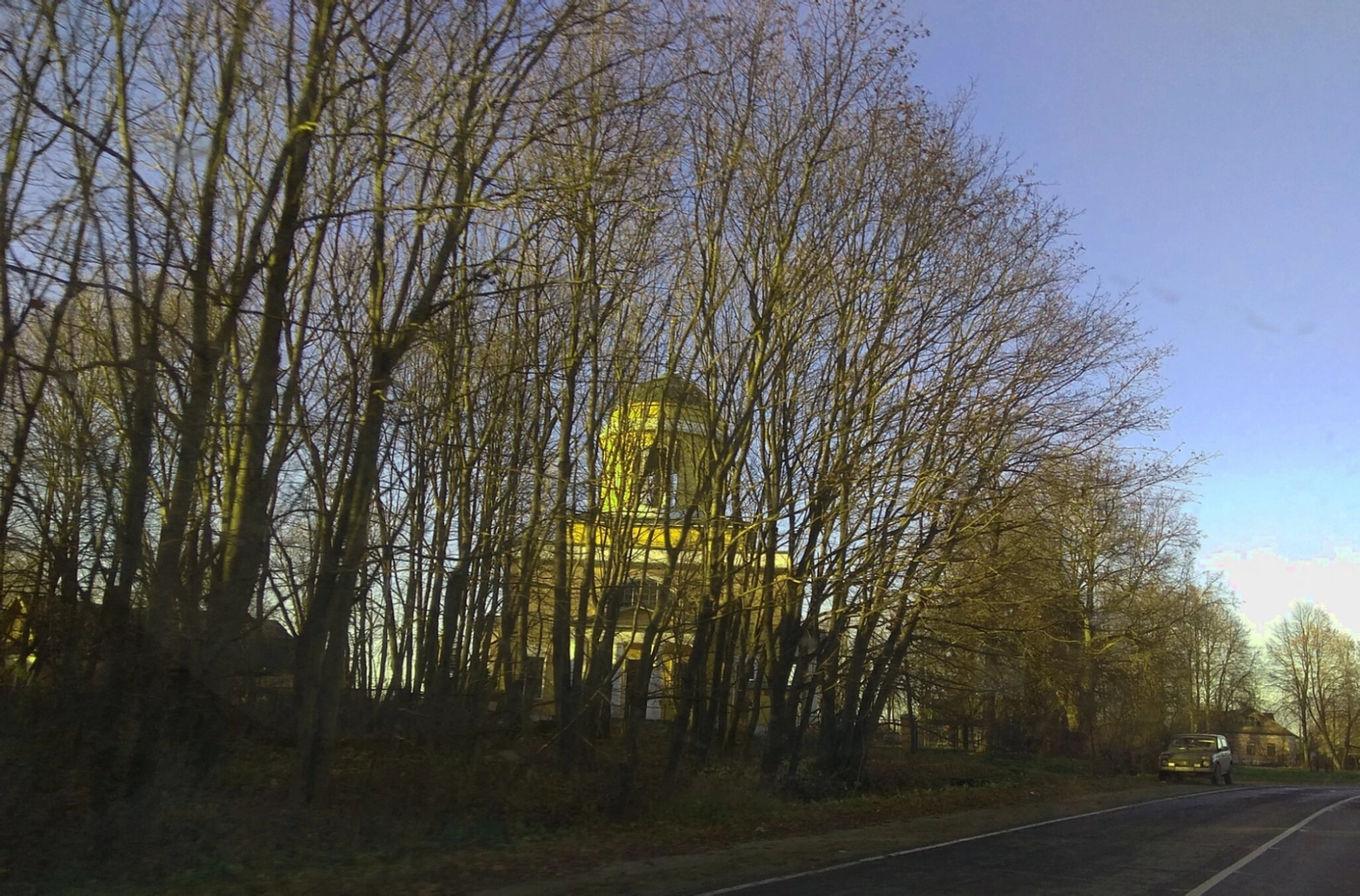 Храм частично скрыт за голыми ветвями деревьев, что указывает на осенний или зимний период съёмки. Многочисленные деревья окружают церковь, создавая естественное природное обрамление для святого места. На переднем плане фотографии проходит асфальтированная дорога, вдоль которой у обочины припаркован автомобиль.