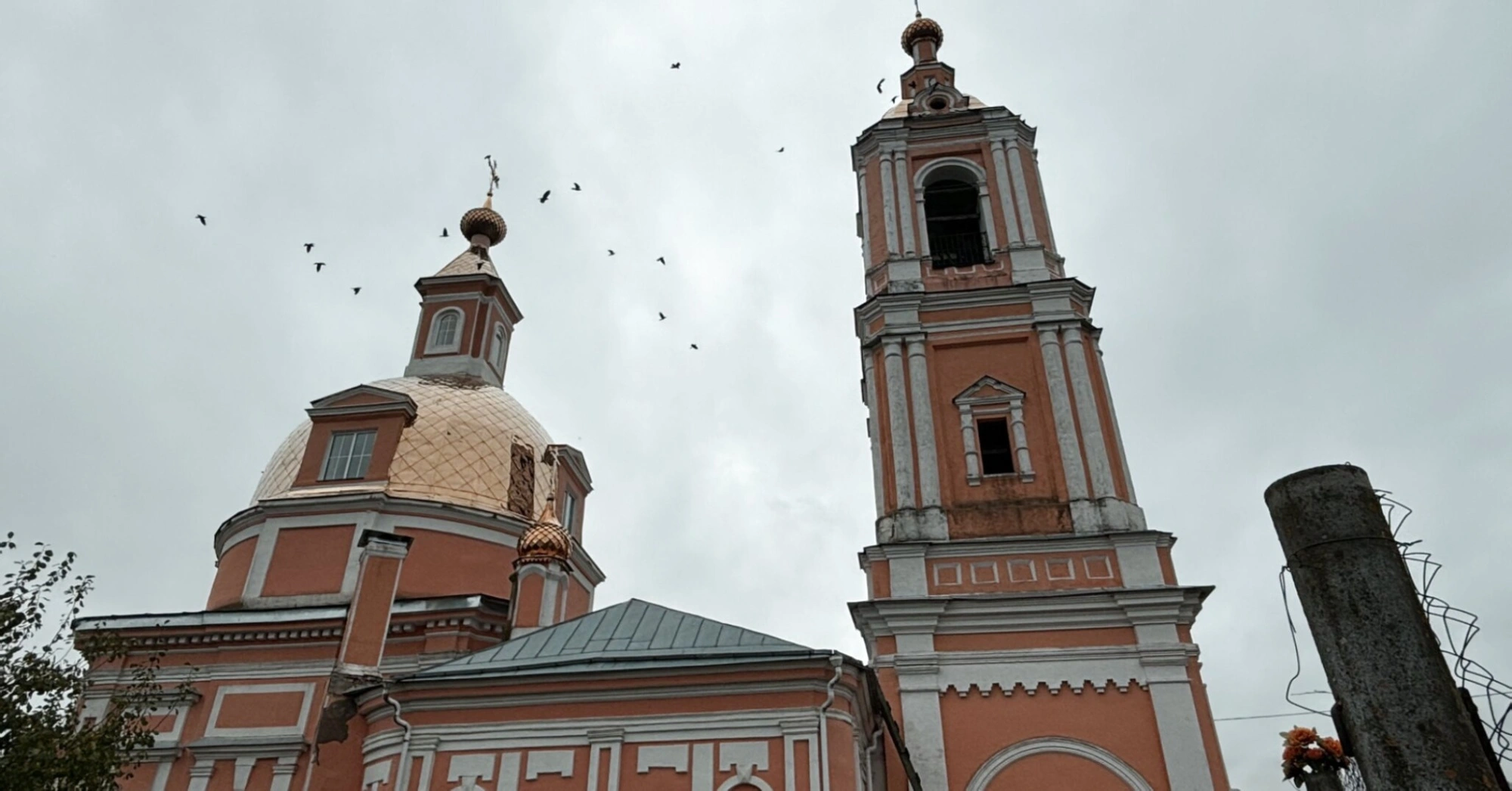 Фасады здания окрашены в тёплый жёлтый цвет и богато украшены белыми декоративными элементами, что характерно для храмового барокко. Сохранилась историческая кровля, соединяющая основной объём с колокольней. На переднем плане фотографии видно традиционное церковное ограждение, а на заднем плане — пасмурное небо с летящей стаей птиц, что создаёт особую духовную атмосферу.