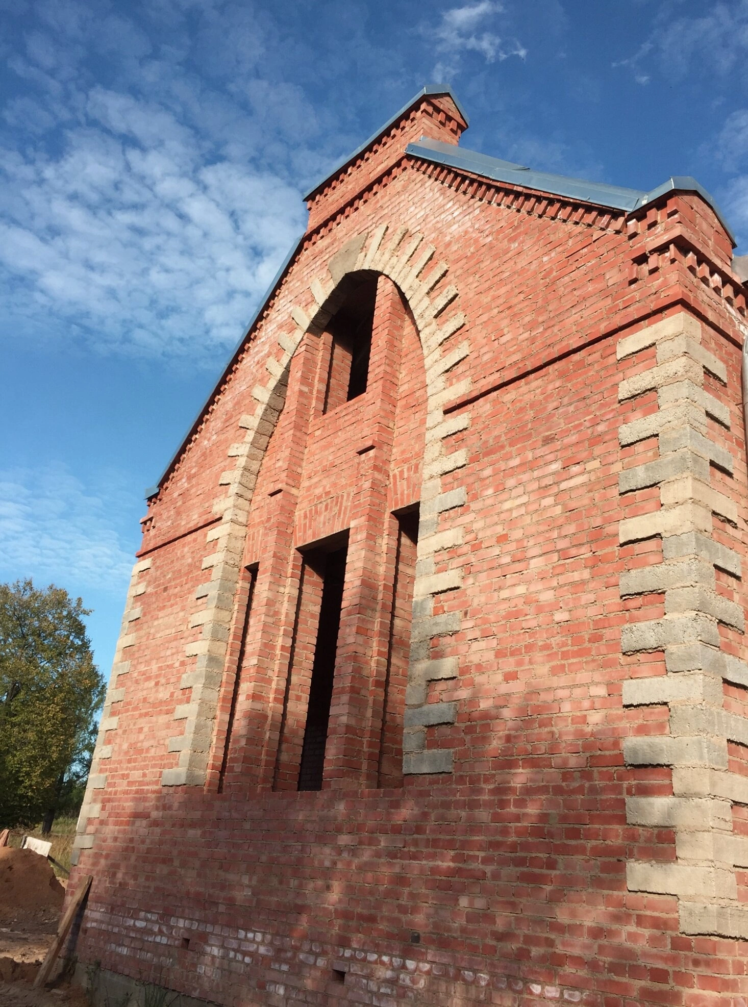 На снимке хорошо просматривается фасадная часть храма, украшенная арочными оконными проёмами, характерными для православного зодчества. Кирпичная кладка демонстрирует высокое мастерство строителей прошлого, а гармоничное сочетание различных оттенков кирпича создаёт особую выразительность архитектурного облика.