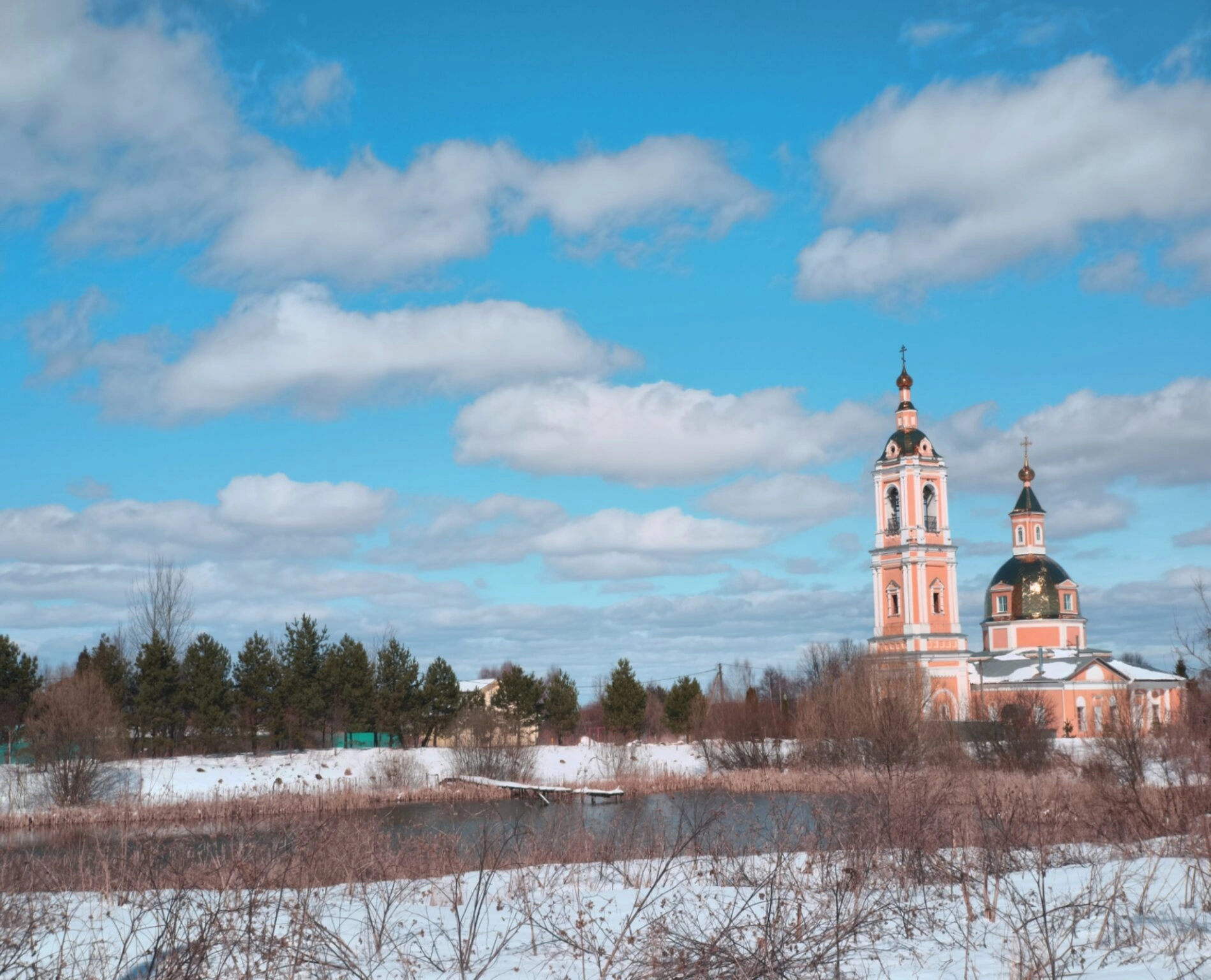 Зимнее время придаёт фотографии особую атмосферу духовной сосредоточенности. Земля укрыта чистым снежным покровом, а деревья и кустарники на переднем плане, лишённые листвы, подчёркивают величие церковного строения. Перед храмом виден небольшой замёрзший водоём, через который перекинут деревянный мостик, добавляющий композиции живописности.