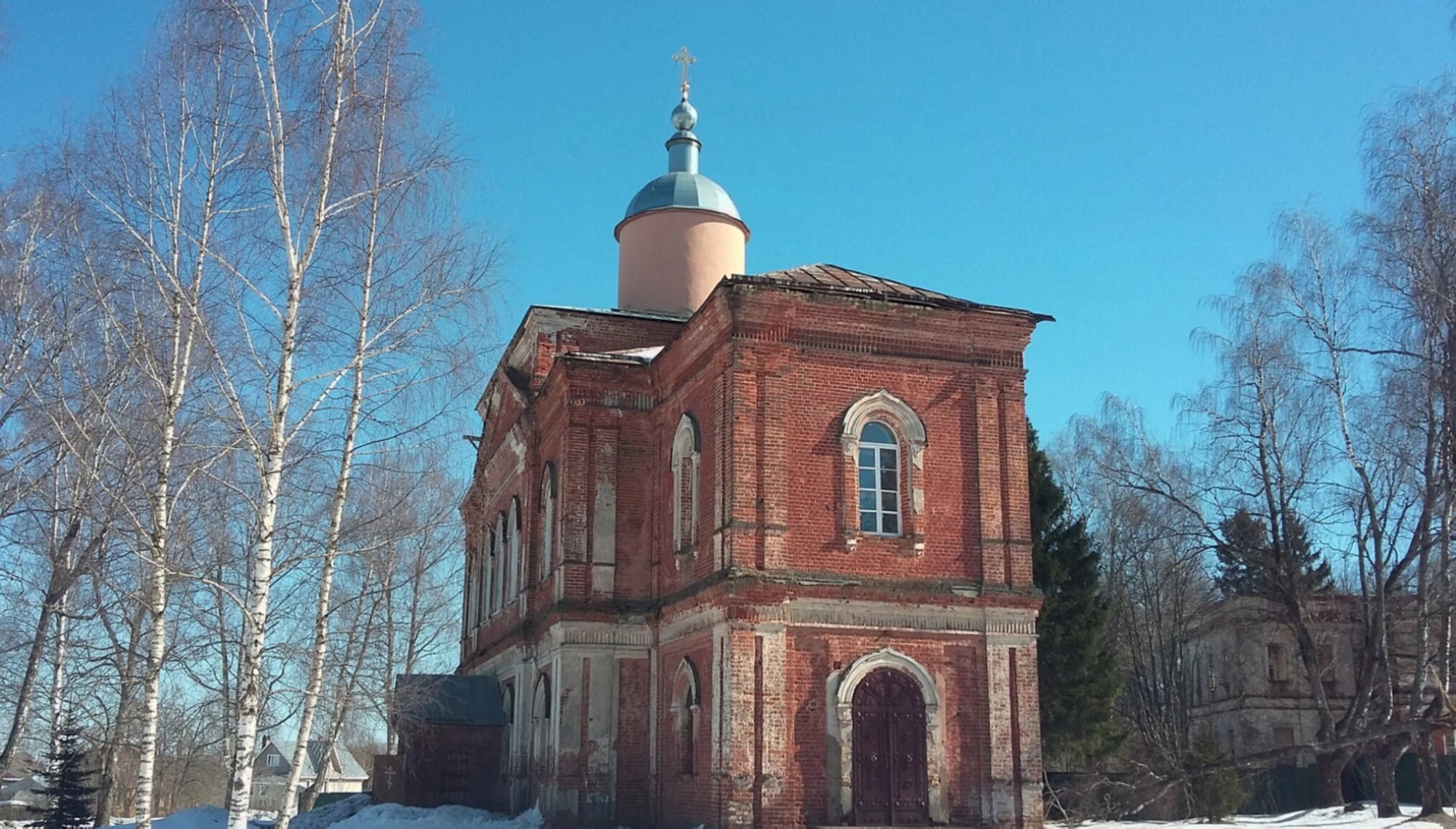 Снимок сделан в зимний период, о чём свидетельствует снежный покров, укутавший землю, и деревья с обнажёнными ветвями, окружающие церковную территорию. Храм предстаёт в умиротворённом зимнем убранстве, создавая особую духовную атмосферу.