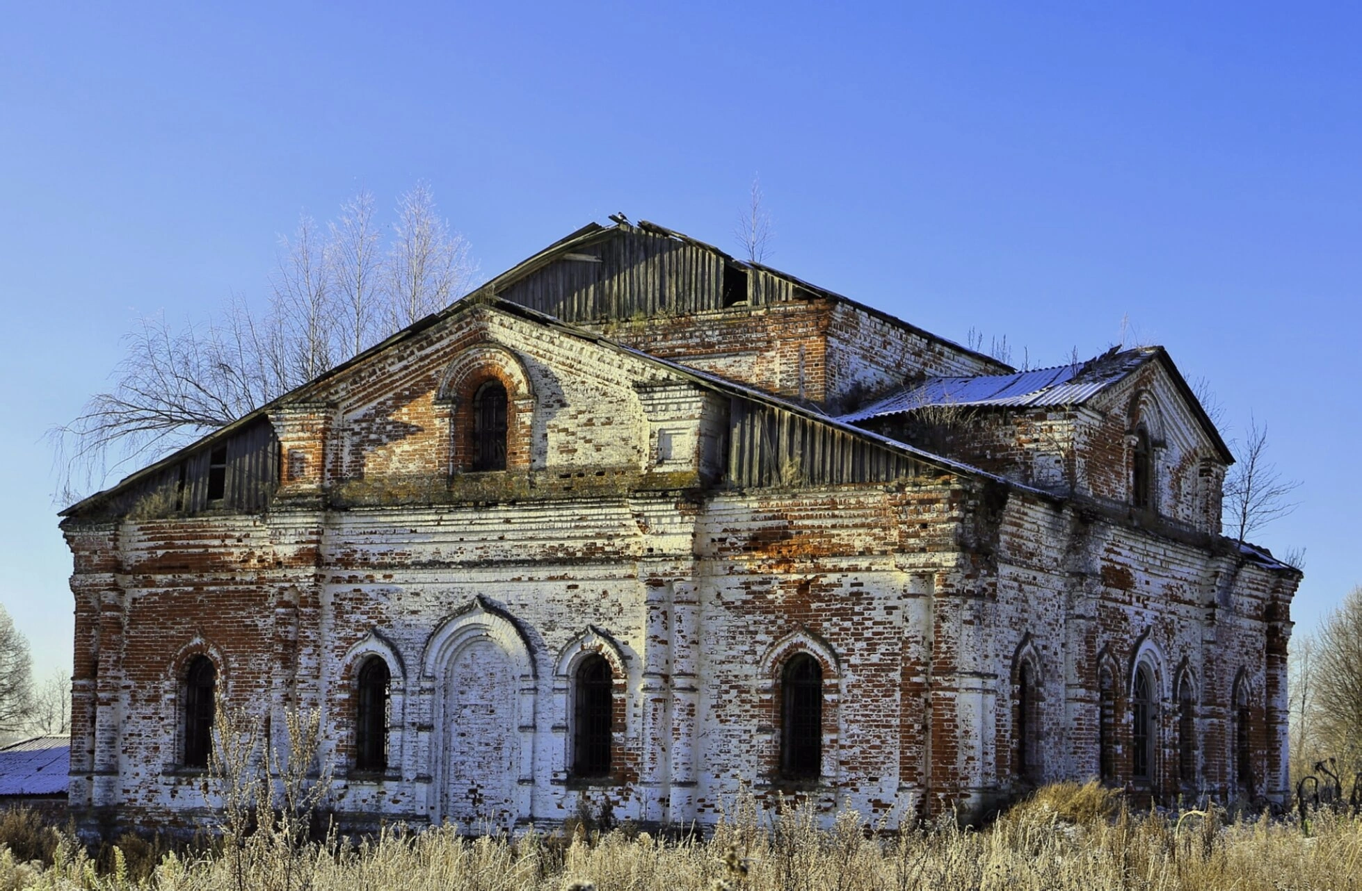 К сожалению, в настоящее время святыня пребывает в удручающем состоянии. Фотография фиксирует отсутствие куполов и колокольни, которые были утрачены в годы запустения. Кровля здания частично обрушилась, что свидетельствует о длительном отсутствии реставрационных работ. Окружающий пейзаж с сухой травой и деревьями без листвы передаёт осенне-зимний период съёмки, усиливая впечатление заброшенности этого некогда благолепного храма.