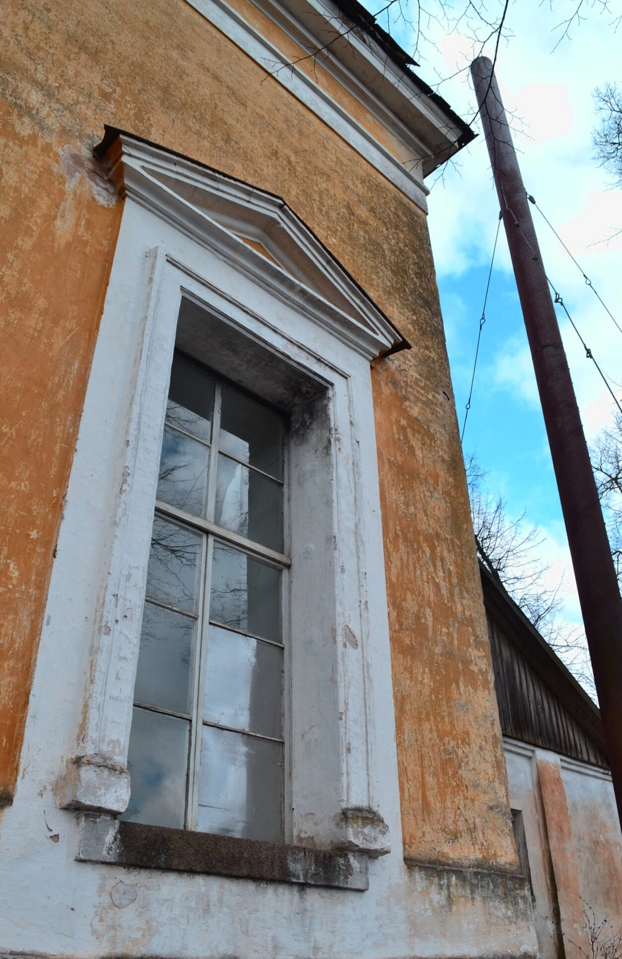 На фотографии запечатлен фрагмент фасада Богоявленской церкви в селе Яконово Тверской области, выдающийся памятник храмовой архитектуры XIX века. Снимок демонстрирует характерный элемент классического стиля — оконный проем с декоративным наличником и сандриком, выполненный с строгим соблюдением ордерной системы. Стены из желтой штукатурки несут следы времени, напоминая о долгой истории этого святого места.