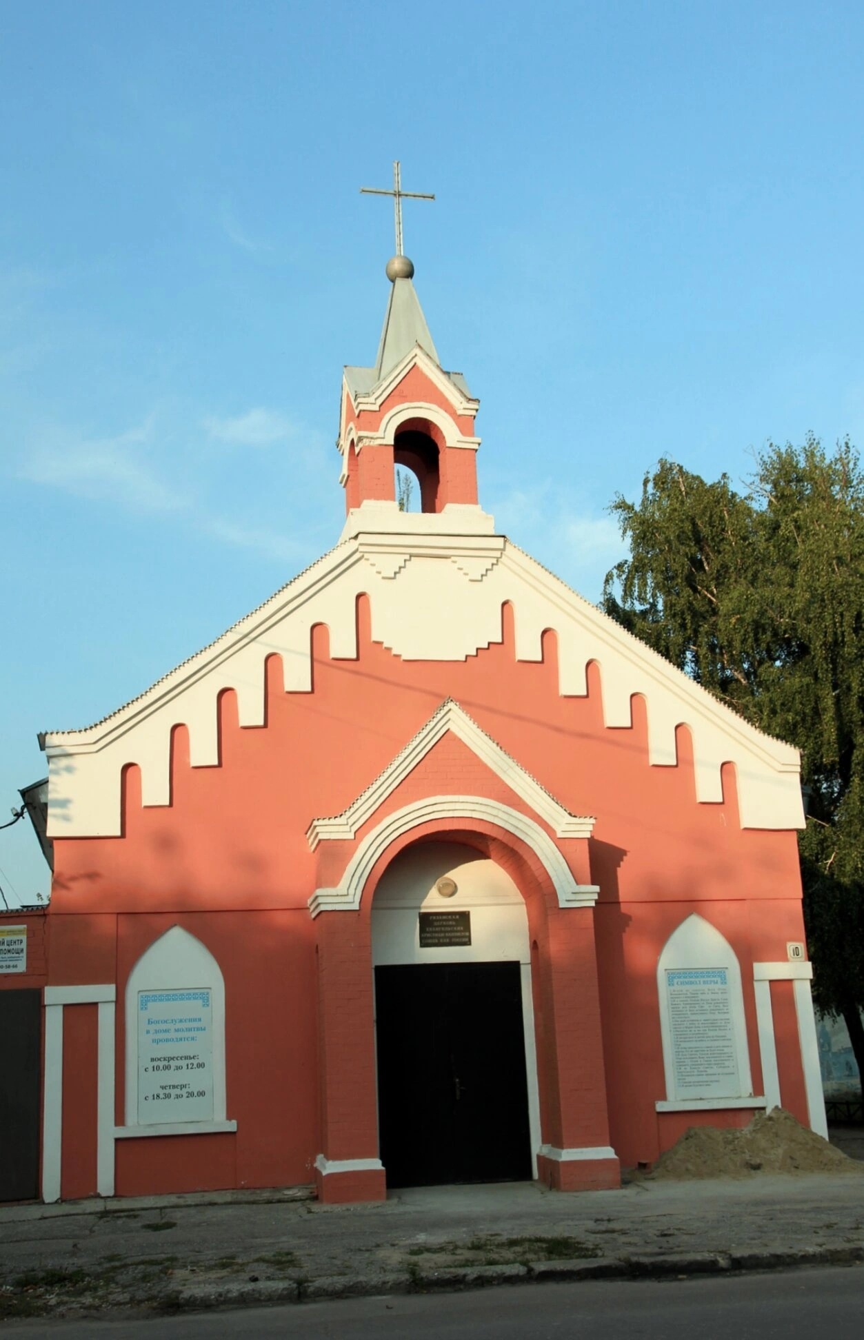 Представленная фотография запечатлела один из ярких примеров православной архитектуры города Рязани — Церковь Богоявления. На снимке хорошо видно компактное одноэтажное здание храма, фасад которого выкрашен в тёплый оранжевый цвет, что создаёт ощущение света и благодати. Белоснежные архитектурные детали, обрамляющие фронтон и арочный вход, контрастно выделяются на основном фоне, подчёркивая строгость и изящество форм.