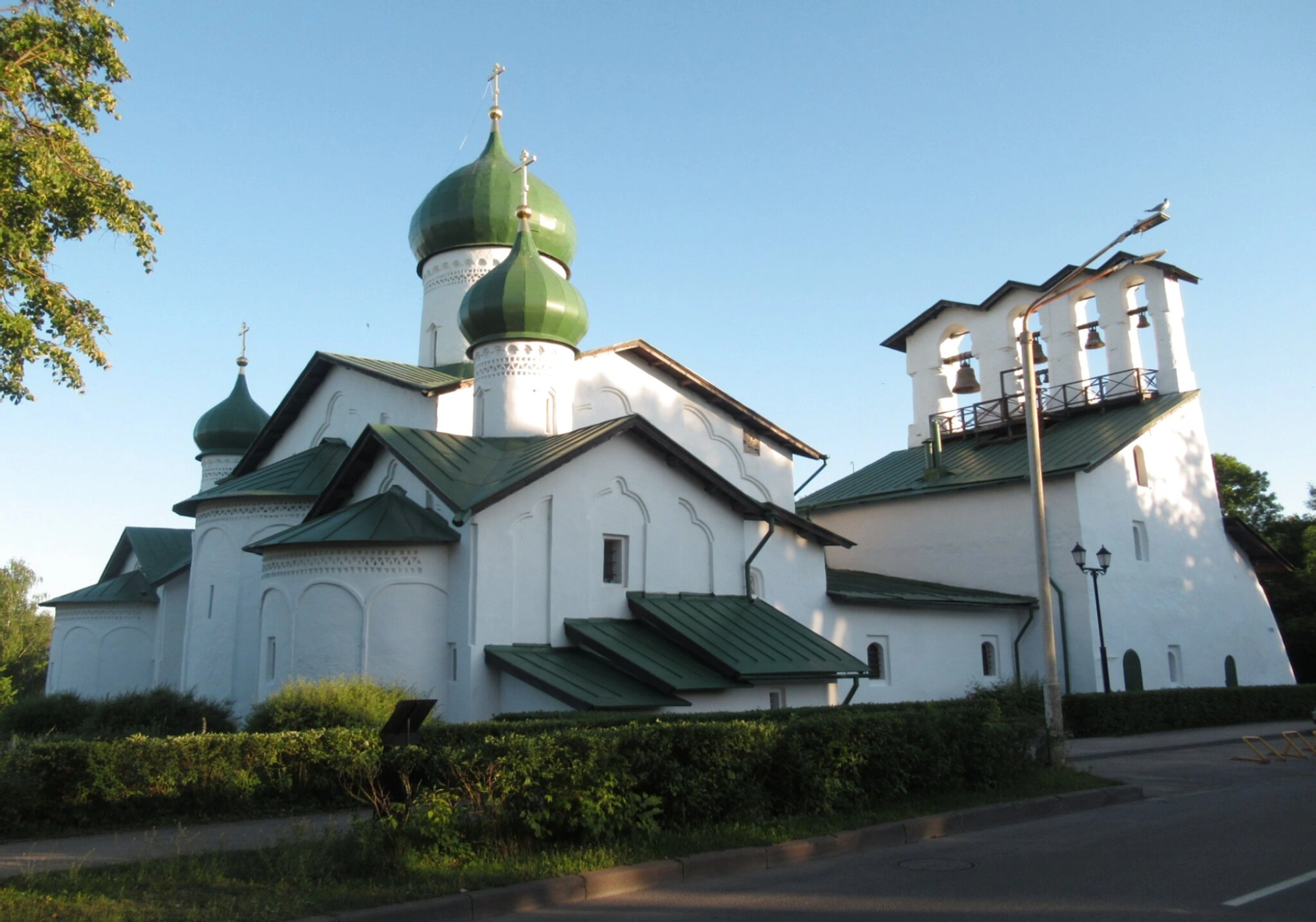 Мягкий солнечный свет, падающий на белые стены и зелёные купола, подчёркивает благодатную красоту этого святого места, которое на протяжении многих веков является духовным центром Запсковья.