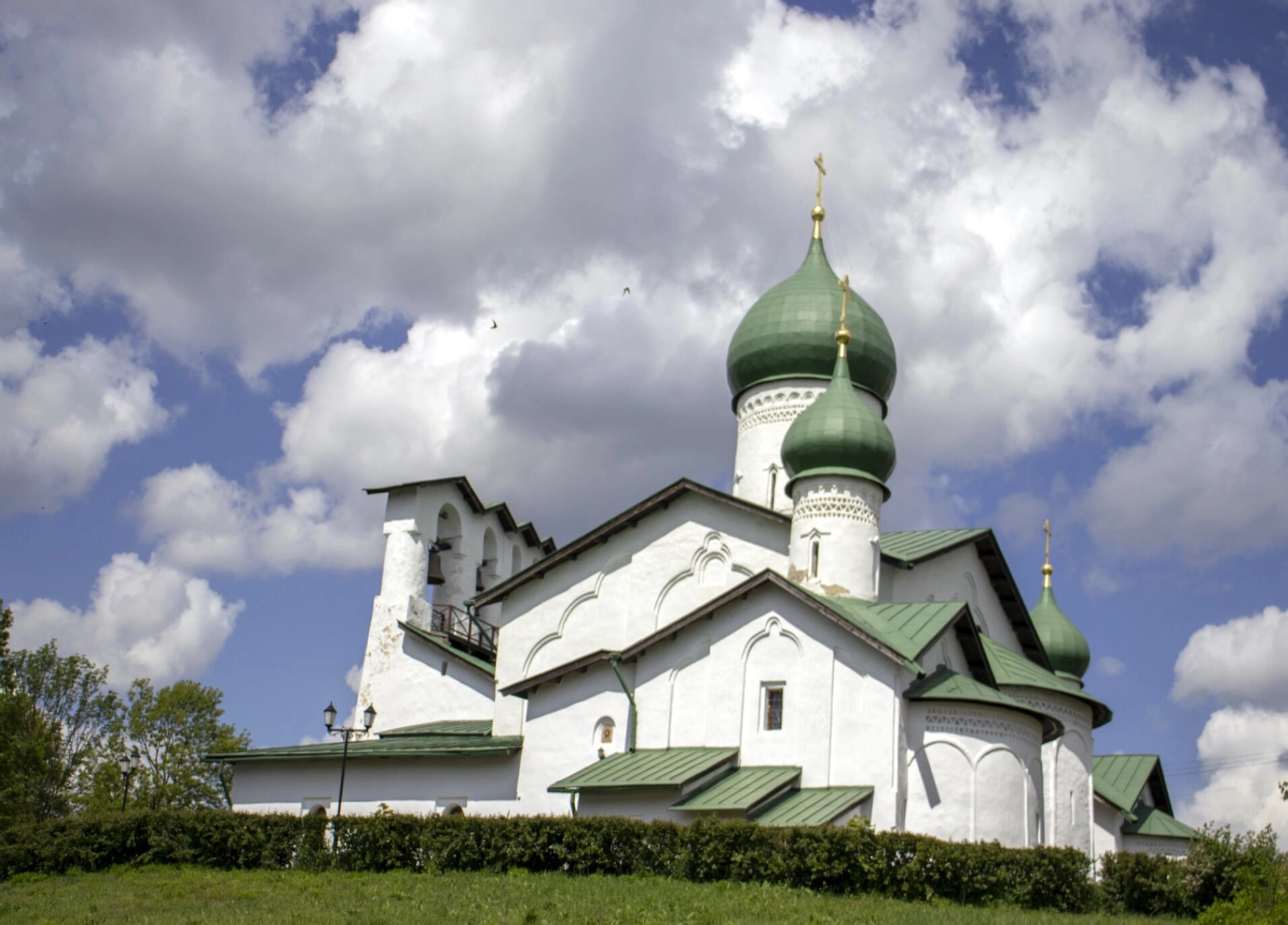 На фотографии запечатлён величественный вид Церкви Богоявления Господня с Запсковья — выдающегося памятника псковской архитектурной школы, расположенного на живописном берегу реки Псковы. Храм, освящённый в честь Святого Богоявления, является одной из жемчужин древнего Пскова и воплощает в себе многовековые традиции православного зодчества.