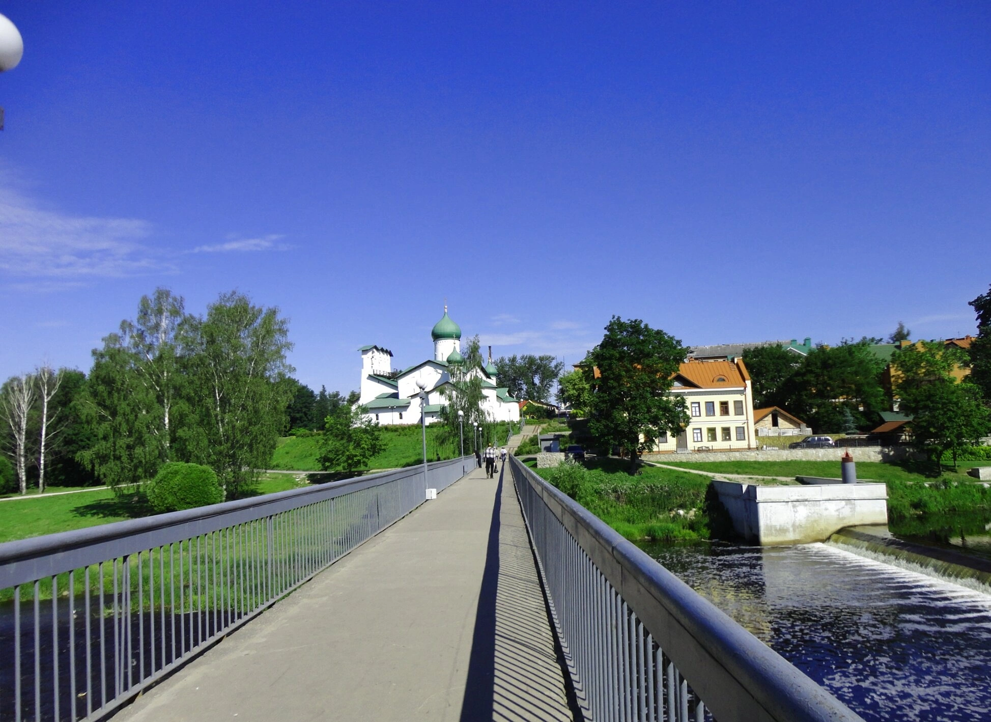 На представленной фотографии запечатлён живописный вид на православную святыню Пскова — Церковь Богоявления с Запсковья. Снимок выполнен с пешеходного моста, перекинутого через реку Пскову, что позволяет оценить величественное расположение храма на берегу.
