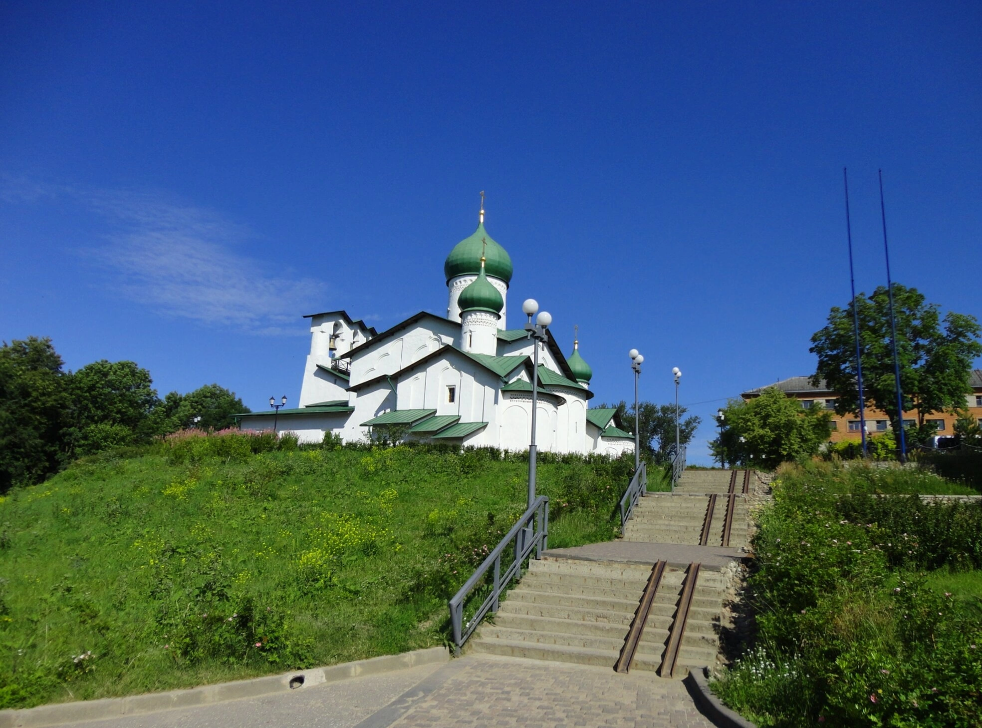 На фотографии запечатлён выдающийся памятник древнерусской церковной архитектуры — храм Богоявления Господня с Запсковья, расположенный в исторической части Пскова на высоком берегу реки Псковы. Этот величественный православный храм, освящённый в честь Крещения Господня, является одним из ярчайших образцов псковской архитектурной школы и входит в список всемирного наследия ЮНЕСКО.